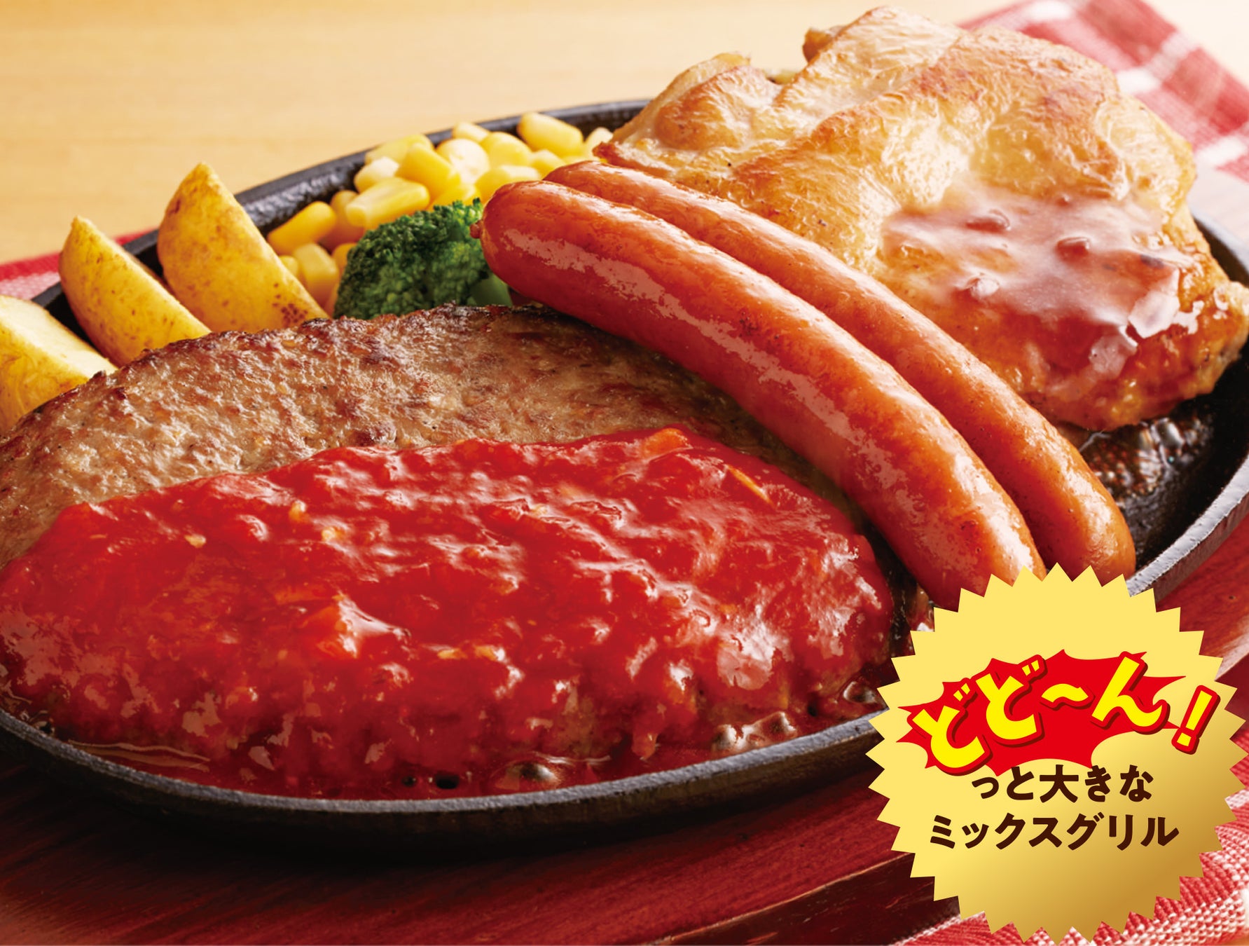 人気メニューの「ミックスグリル」が大きくなって登場する一品は、まさに「肉のお祭り」です。