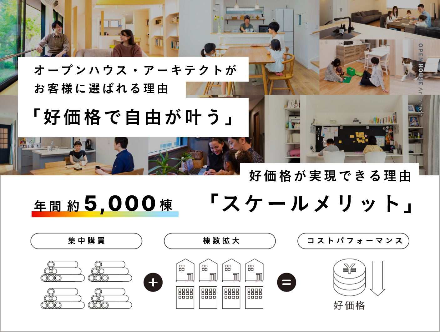 戸建住宅ならではの価値である「自由」を届けつつ、年間施工棟数 約 5,000 棟のスケールメリットを活かし、資材・施工コストの抑制を実現しています。
