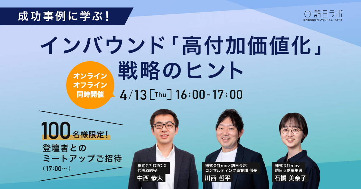 国内最大級のインバウンド総合メディア「訪日ラボ」を運営する株式会社mov(代表取締役:渡邊 誠、本社:東京都渋谷区、以下mov)は、株式会社D2C X(代表取締役社長:中西 恭大、本社:東京都港区、以下D2C X)と共催で、セミナー「成功事例に学ぶ!インバウンド『高付加価値化』戦略のヒント」を開催します。オンライン/オフライン同時開催で、日時は4月13日(木) 16:00~17:00、参加費は無料です。