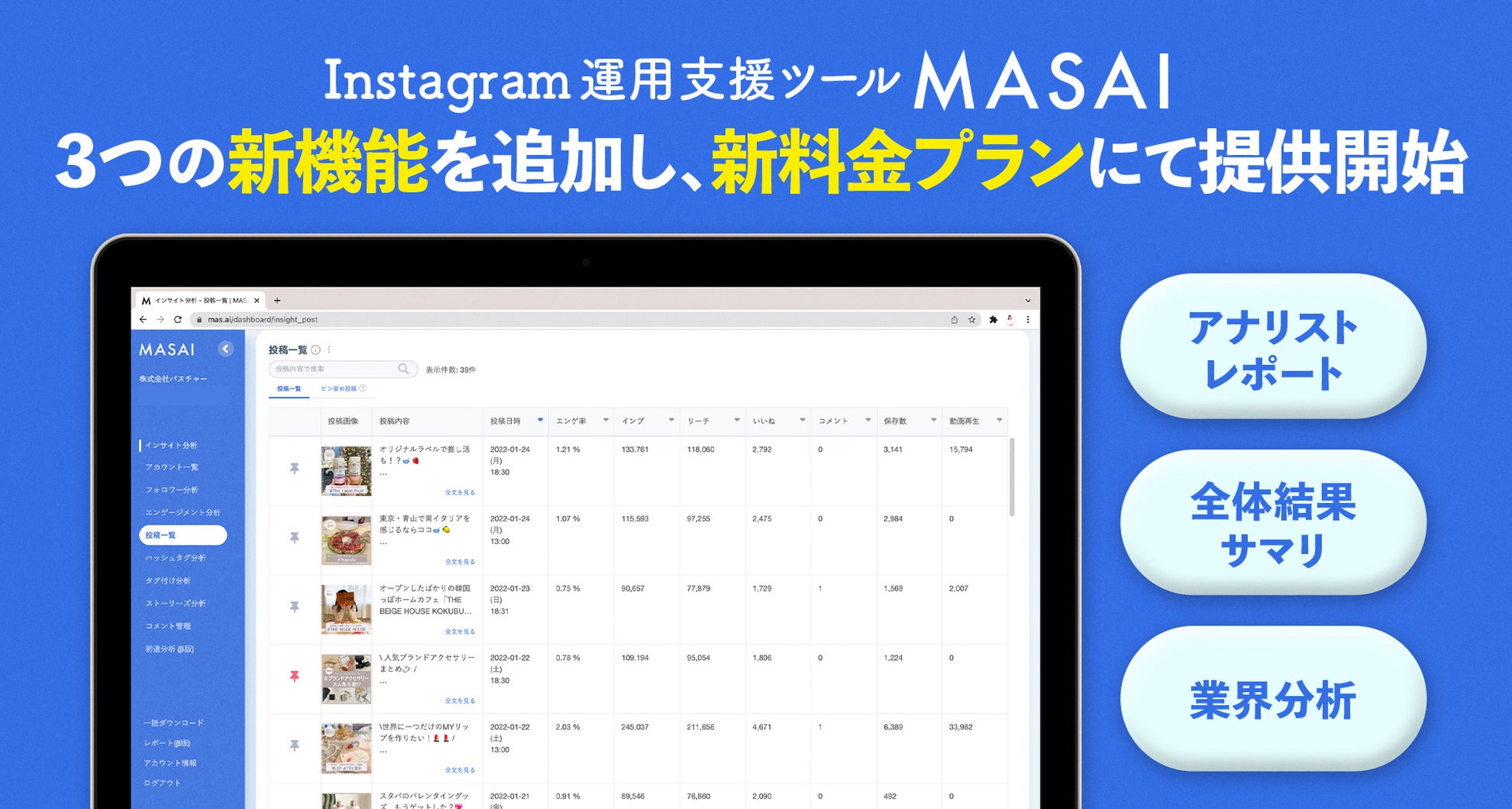 Instagramを中心にSNSマーケティング支援を行う株式会社パスチャー(本社:東京都港区、代表取締役:甲斐 優理子、以下当社)は、当社が提供するInstagram運用支援ツール「MASAI」において、Instagram運用を成功へ導くための3つの新機能をリリースし、利用料金およびプランを改定することをお知らせいたします。