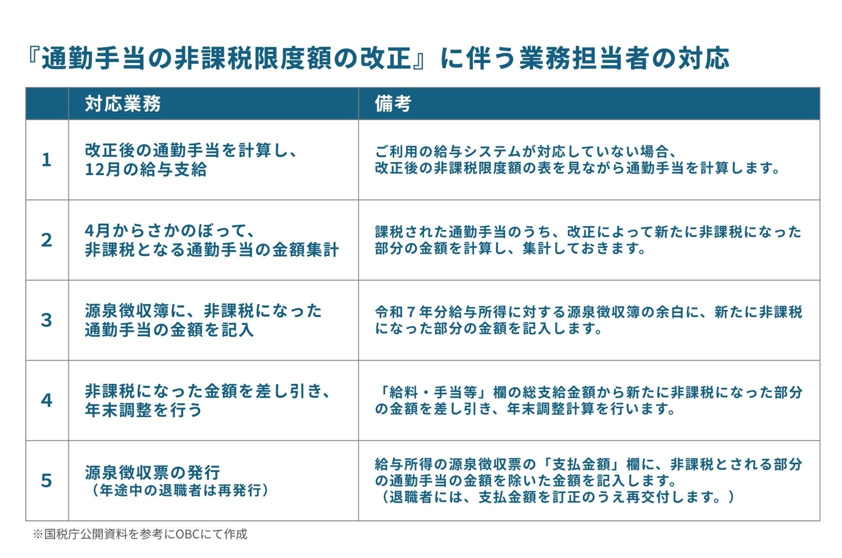 OBCは「通勤手当の非課税限度額の改正」において、業務担当者が業務負担なく改正対応できるよう3つの支援を実施します。