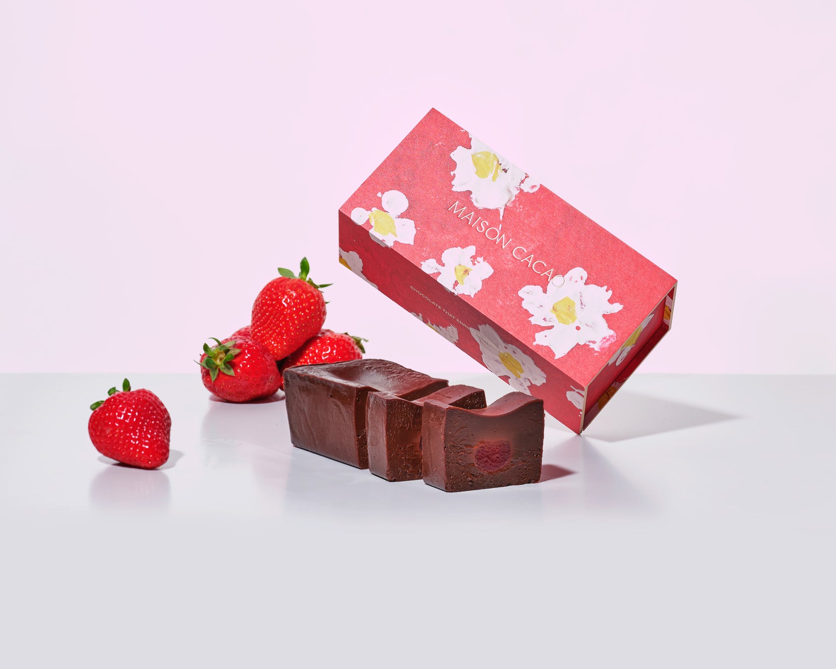 チョコレートそのものの美味しさを味わう生ガトーショコラ。コロンビアの自社管理農園で収穫した新鮮なカカオのみを使用し、みずみずしい「半生」の食感で焼き上げたメゾンカカオの看板品です。今回はコロンビアで作り上げるオリジナルのクーベルチュールの中から、あまおう苺と相性の良い香り高いビターチョコレートを厳選。福岡県糸島の大粒のあまおう苺と贅沢に合わせた、ホワイトデー限定の生ガトーショコラです。