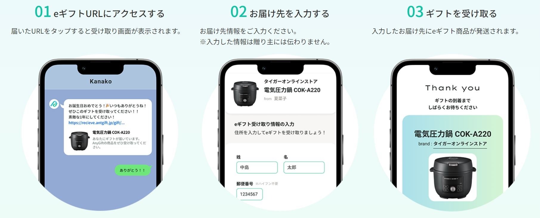 いつもお世話になっている方へのちょっとしたプレゼントや、大事な人への誕生日や記念日、サプライズをしたいときなど、相手の住所を知らなくても気軽に「タイガー魔法瓶」の商品をギフトとして贈ることが可能です。URLはご注文後すぐに発行されるので、お相手の方にすぐに贈ることができます。