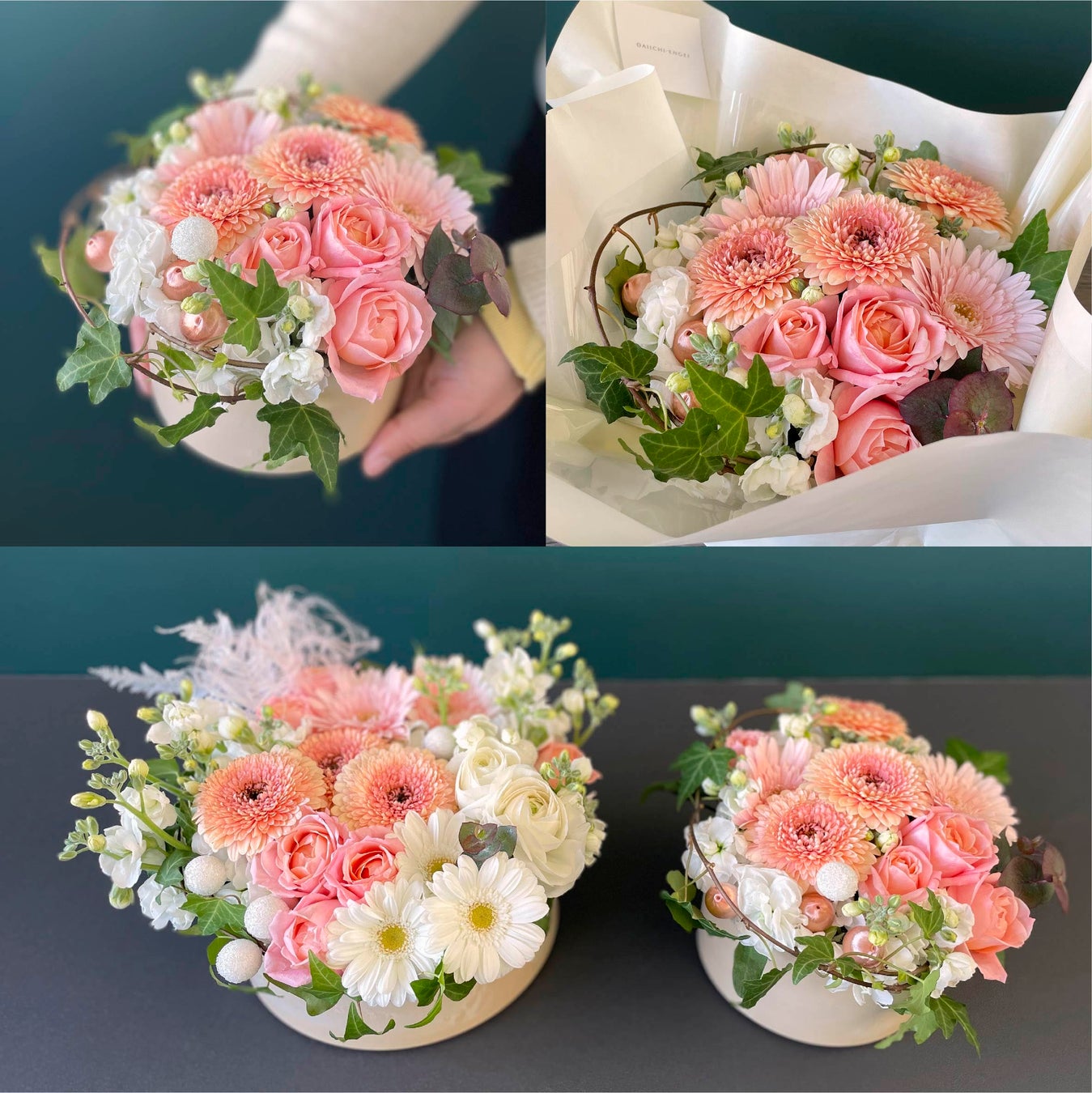 アレンジメントはそのまま飾ることが出来るので、花瓶いらずで場所を選びません。日々の感謝の気持ちを込めて大切な方へのギフトにおすすめです。