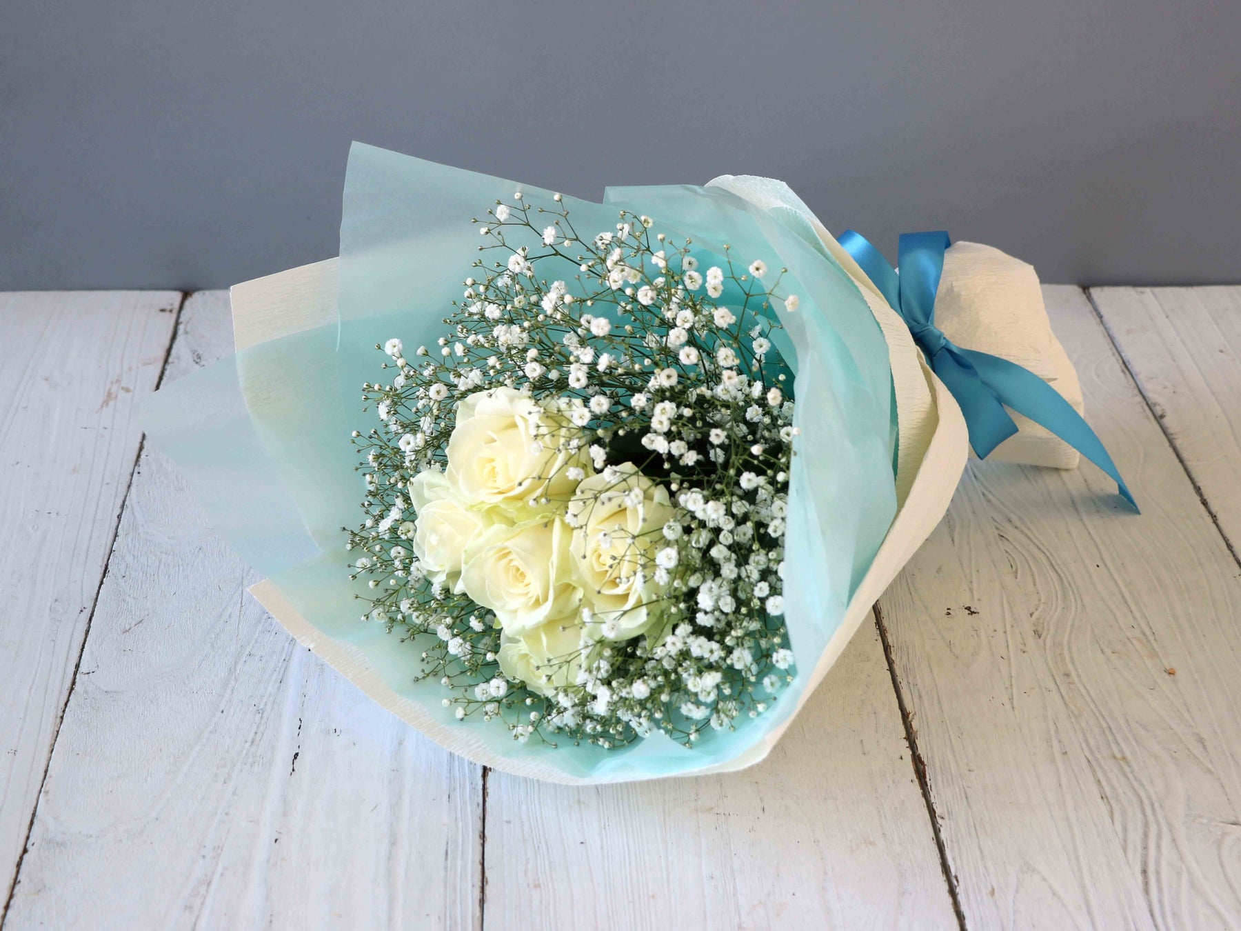 カスミソウが白いバラをふんわりと囲む、優しく繊細なブーケを大切な方へ贈りましょう。