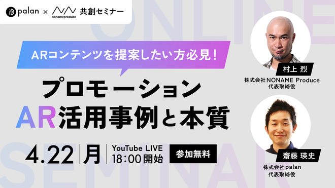 キャンペーンを日々研究/制作を行っているNONAME ProduceとARスタートアップのpalanが、AR技術/ARを活用したプロモーション等について詳しく解説