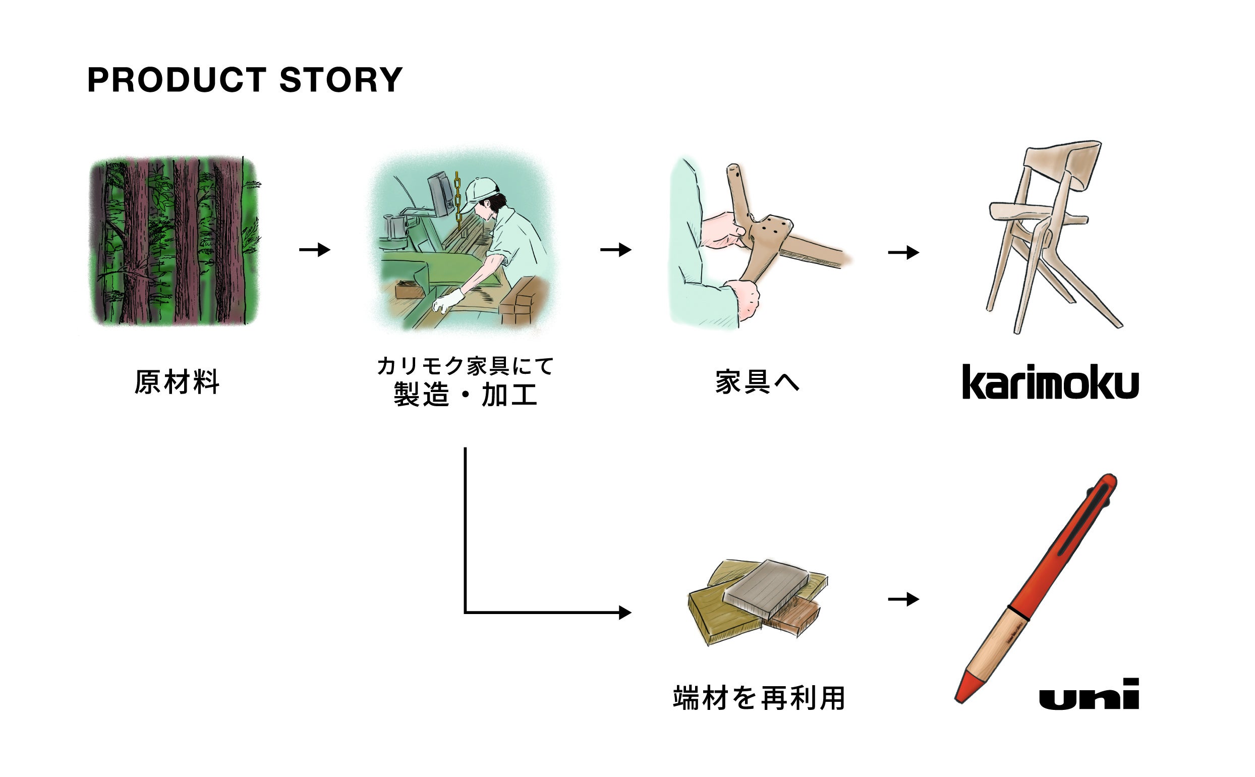 カリモク家具がグループミッションとして掲げる「木とつくる幸せな暮らし」に三菱鉛筆が共鳴し、また、暮らしに身近な家具と筆記具の親和性を感じ、コンタクトを取ったことから今回のコラボレーションが始まりました。板材から家具のパーツを切り出した時に発生する端材を活用し、両社が培ってきた技術・こだわりを詰め込むことで、木材そのものの魅力がより感じられるペンに仕上げました。デザイン性、機能性はもちろんのこと、素材が持つストーリーにも思いをはせ、愛着を持って長くお使いいただければと願っています。