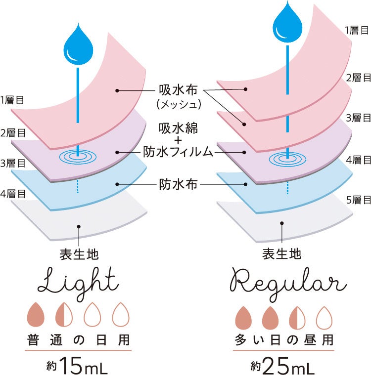 普通の日も、ゆううつな日も、産後・更年期の尿モレが気になる時も、肌戻りしにくいから快適に過ごせて、多層構造×1層目の吸水メッシュ布でサラっと肌戻りしにくい仕様となっております。