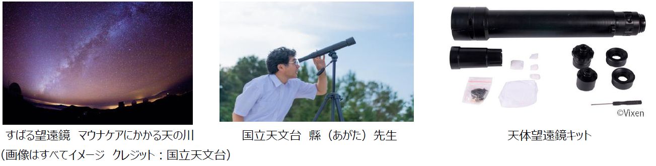 昨年8月の実施に続き、国立天文台の縣(あがた)先生をお招きし、ハワイ島 マウナケアのすばる望遠鏡の星空中継映像やVTRを使って星空講座を開催します。ZOOMのQ&A機能を使った質問コーナーも実施しますので縣先生へ直接質問することが可能です。また、ツアー後半では、国立天文台プロデュースの天体望遠鏡キットを視聴者のみなさまと一緒に作るワークショップを行います。