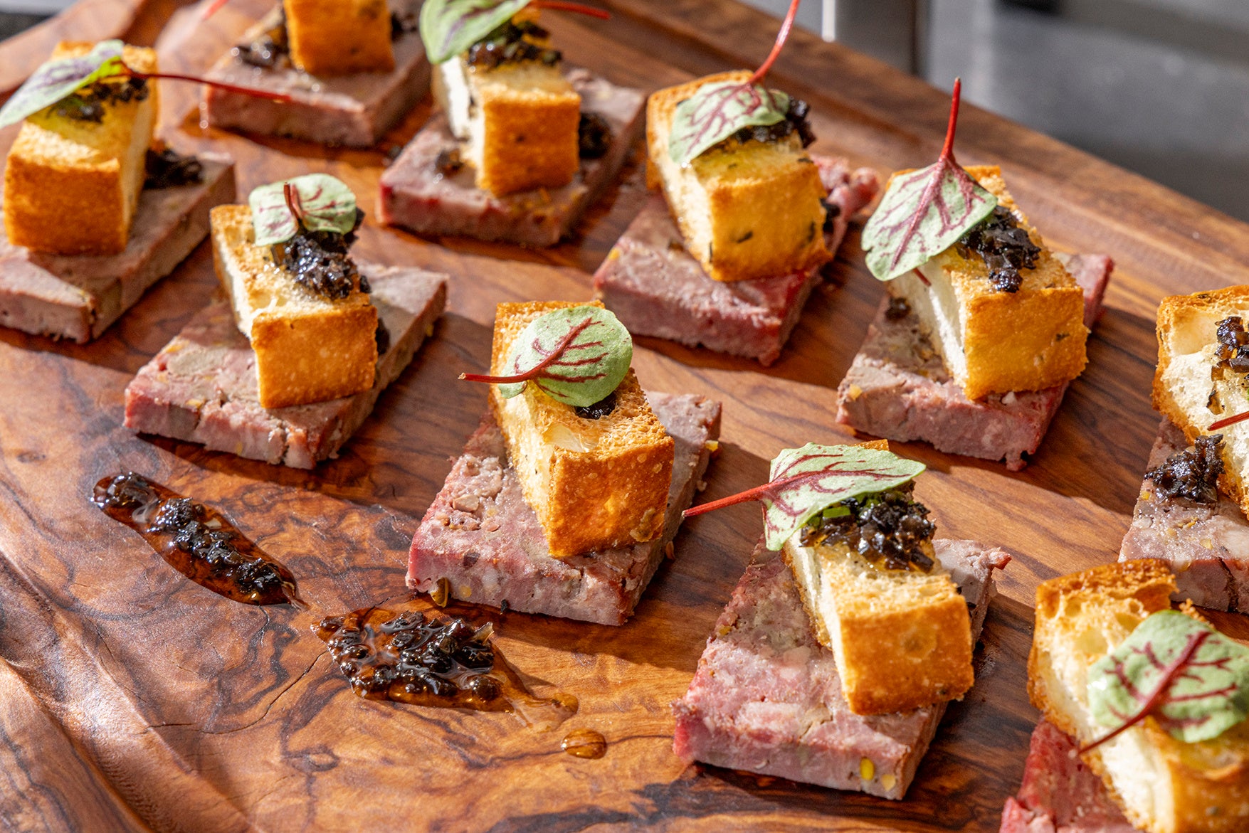 エゾシカの旨味が凝縮した一品。サクサクに焼いたフォカッチャはパテの上にのせて食感を生かし、トリュフ香るハニーソースを添えて深みのある味わいに仕上げました。