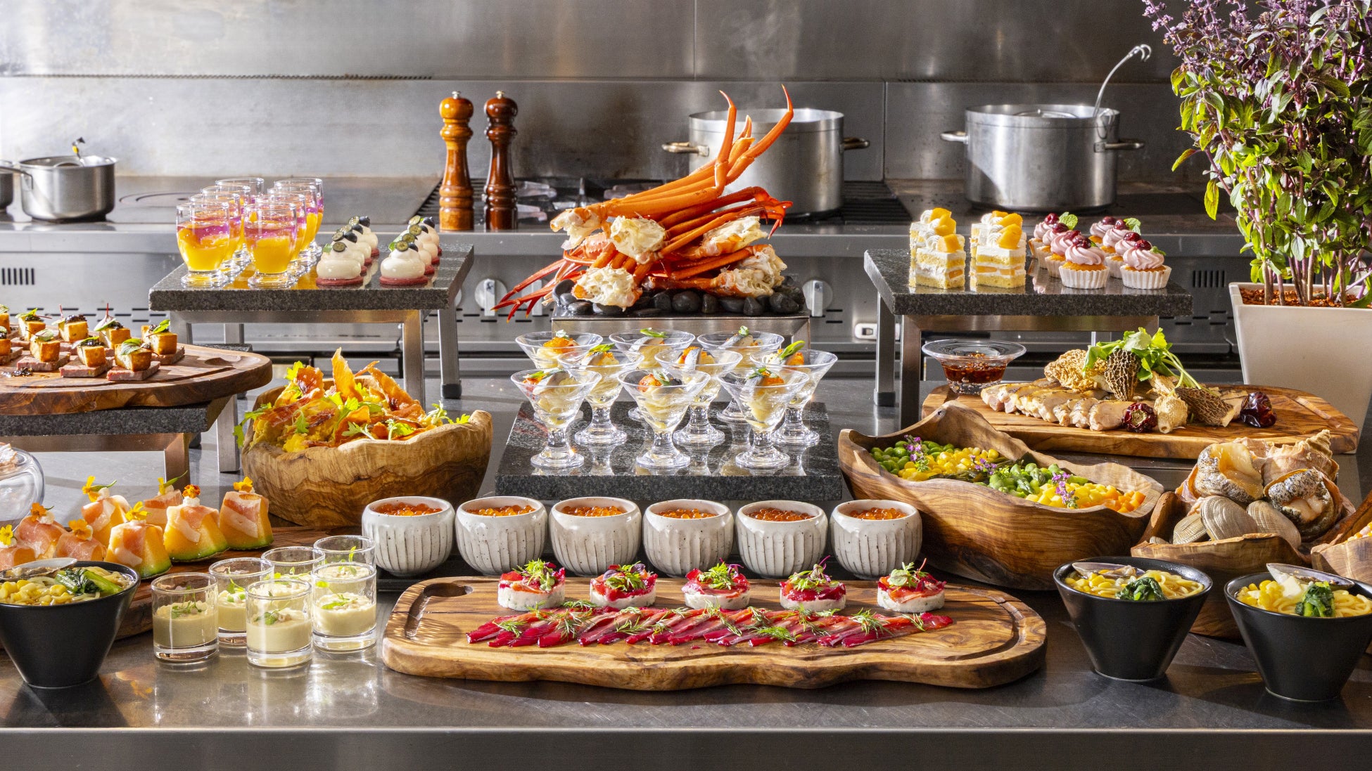 美食の地・北海道は、コンラッド東京のランチビュッフェにおいても人気の高いテーマです。なかでも、「海・山・陸の恵がそろい、冬を越えて旨味が凝縮される夏の北海道産食材は特に魅力的」と語るのは、コンラッド東京 総料理長 水口雅司(みずぐち まさし)。水口が現地で出会い魅了された旬の味覚を、コンラッド東京ならではの多彩なアレンジでお届けいたします。夏にしか味わえない「横綱あさり」と称される大粒のあさりをはじめ、高級魚キンキ、甘味が凝縮した夏野菜など、この季節ならではの北海道産食材がビュッフェ台を彩ります。さらに、4種のコンディメントで異なる味わいを楽しめるズワイガニに加え、メロンのショートケーキや、「不老長寿の実」とも呼ばれる特産品ハスカップを使用したムースなど、素材の魅力を生かしたスイーツ5種も心ゆくまでご堪能いただけます。