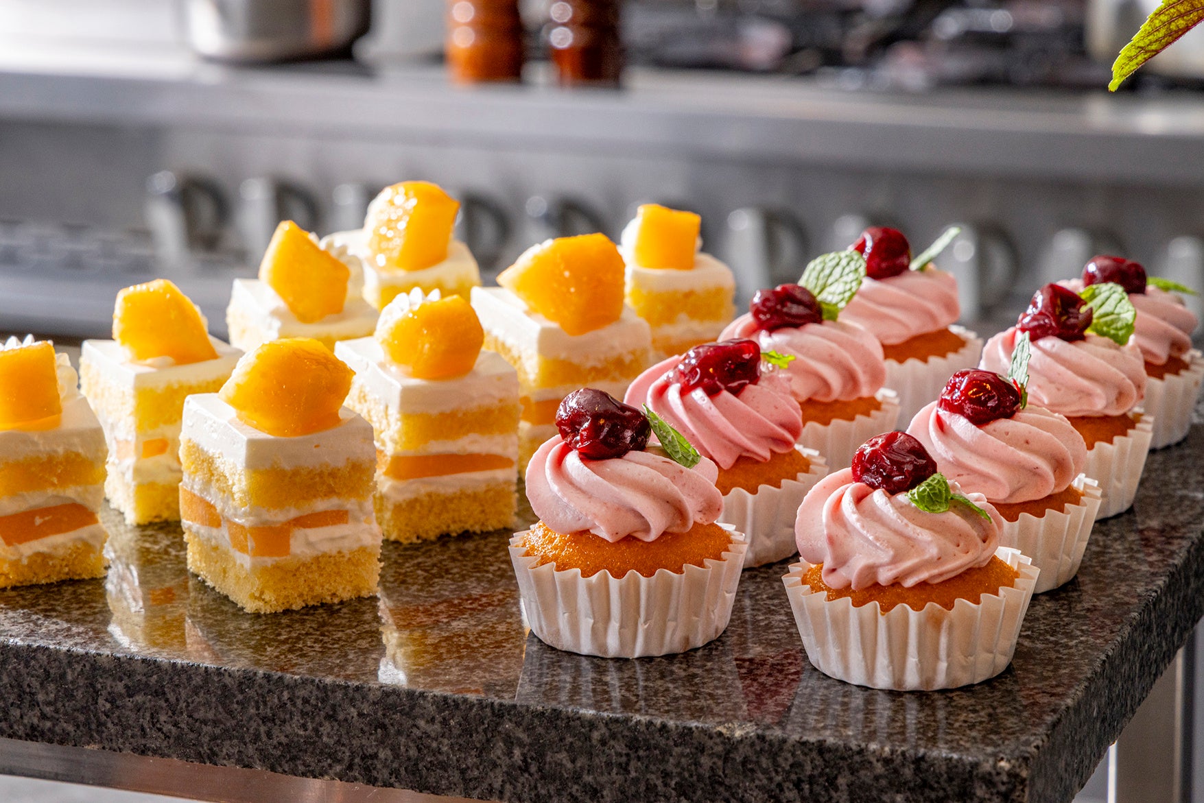 北海道メロンをたっぷり挟んだ軽やかなショートケーキ(写真左)や、バニラのスポンジケーキにグリオットチェリーのクリームとコンポートをトッピングしたカップケーキ(写真右)など、初夏を堪能するデザート5種をお好きなだけ。