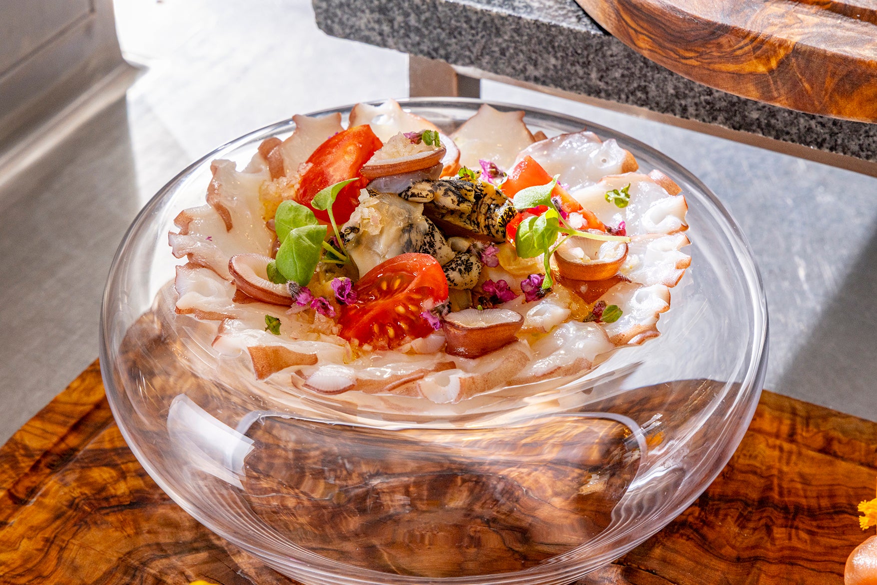· ミズダコのカルパッチョ 北海道完熟トマトとつぶ貝