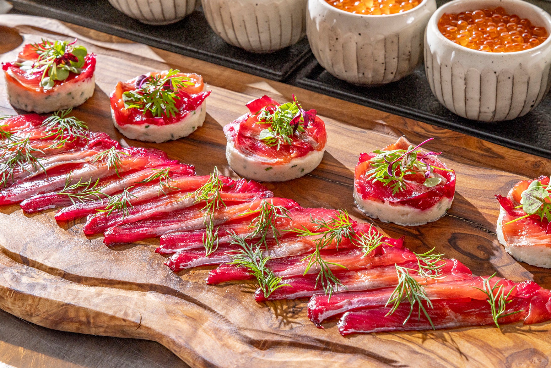 ほど良く脂がのった北海道産トラウトを、ラベンダーとビーツで香りと色合い鮮やかに。ホッケとじゃがいものムースを合わせてご用意いたします。