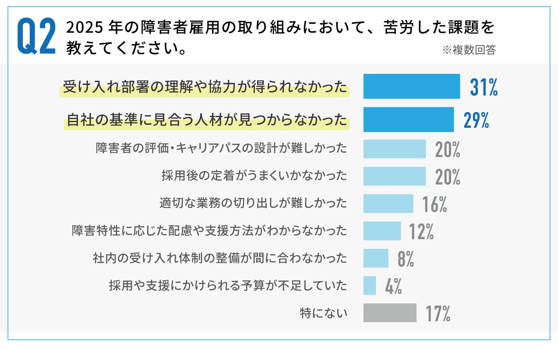 障害者雇用の取り組みにおいて苦労した課題は「受け入れ部署の理解や協力が得られなかった」が31%で最多となり、次いで「自社基準に見合う人材が見つからなかった」が29%となりました。