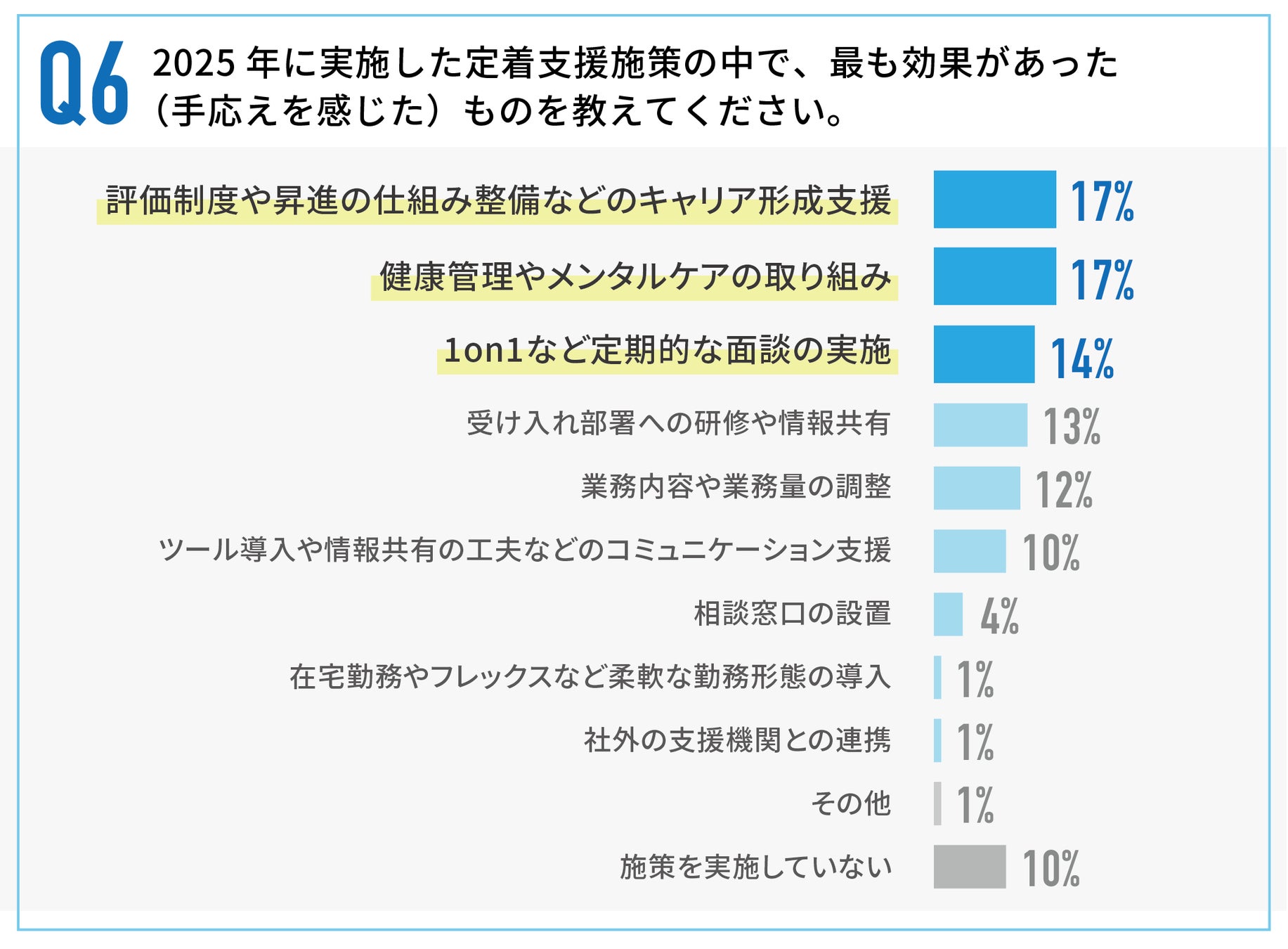 6…定着支援で効果があった施策は「キャリア形成支援」「健康管理・メンタルケア」