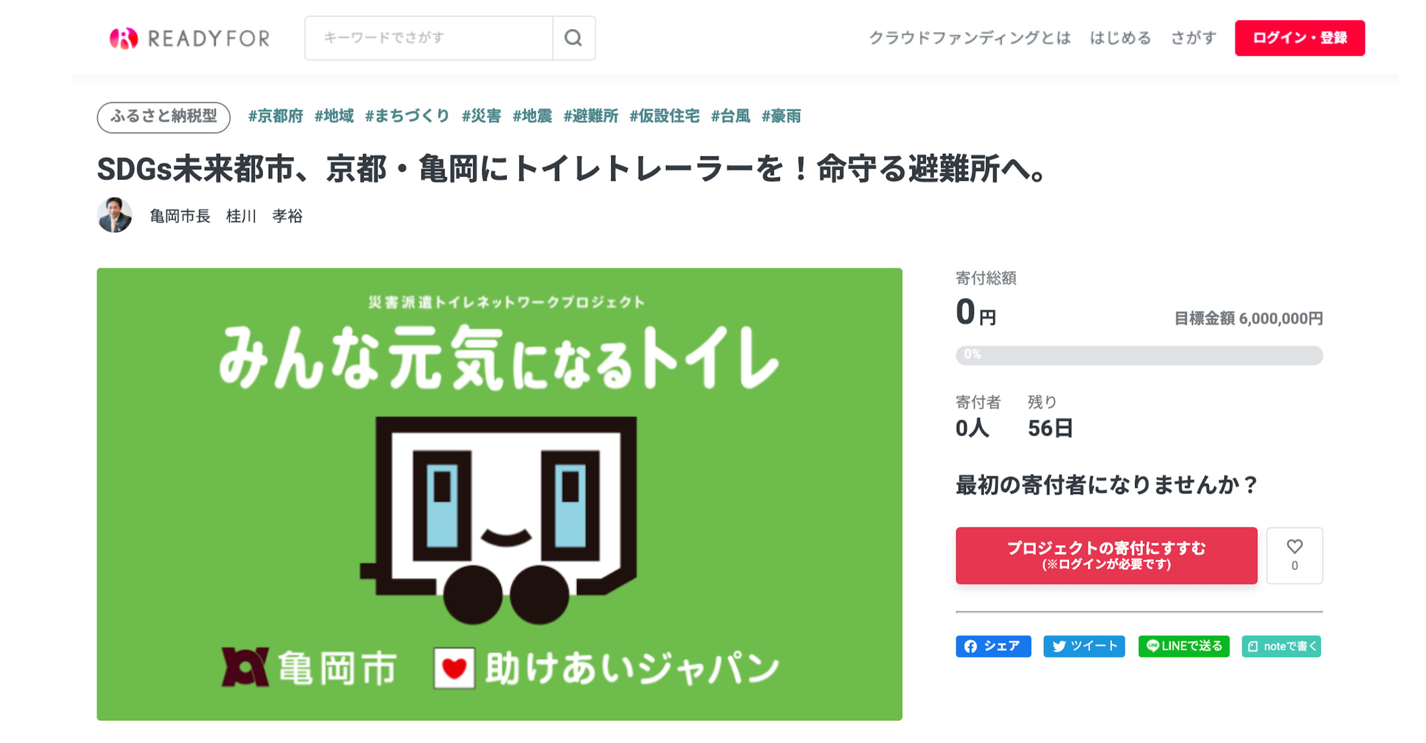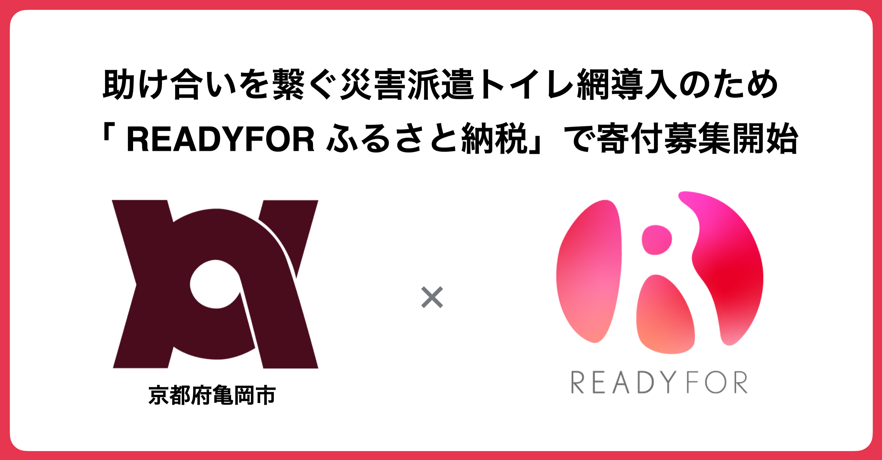 READYFOR株式会社(本社:東京都千代田区、代表取締役CEO:米良はるか)が運営する自治体向けクラウドファンディング「READYFOR ふるさと納税」にて、新たに京都府亀岡市がプロジェクトを開始いたします。クラウドファンディングを通じて集める寄付により、災害派遣トイレトレーラー導入を目指します。