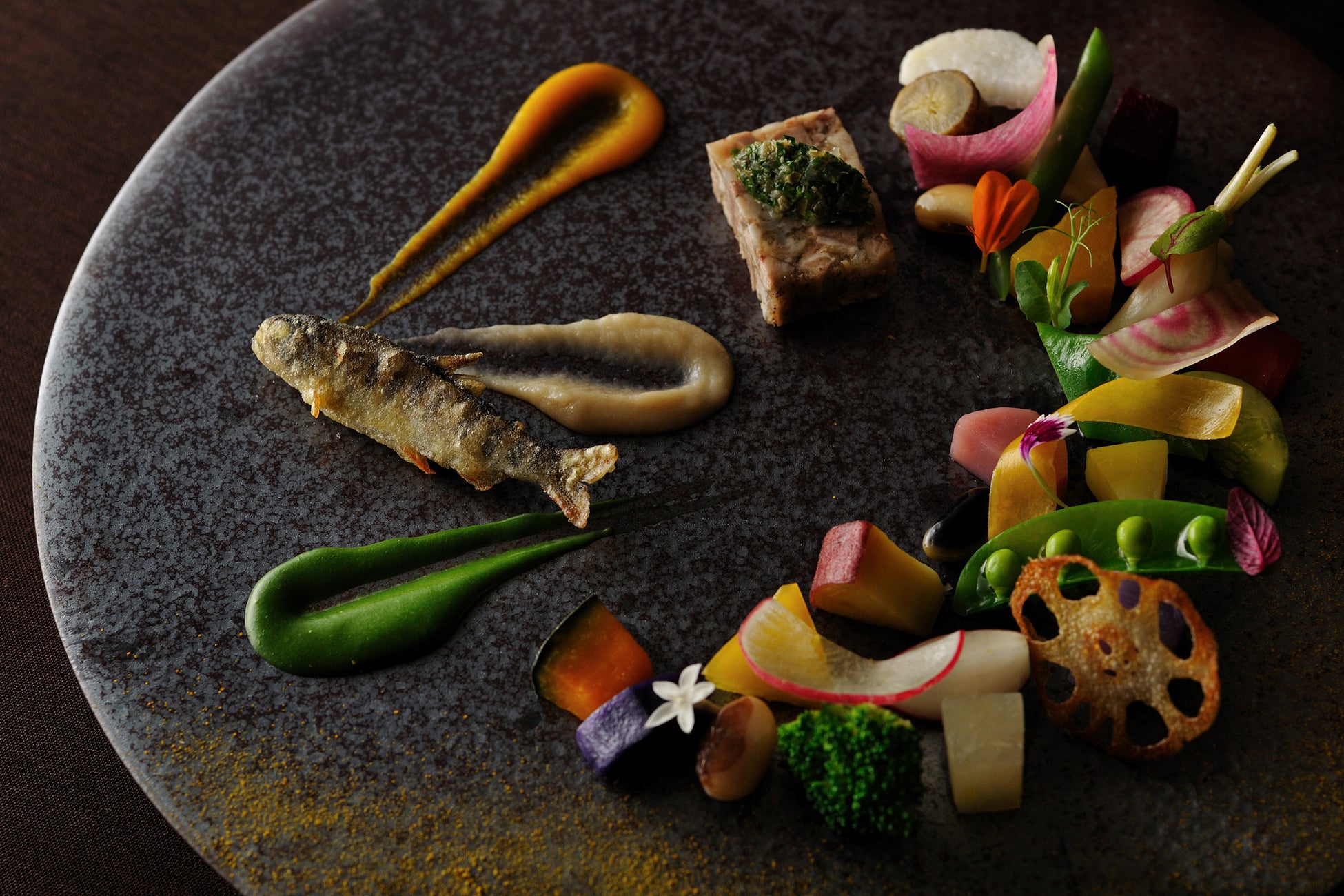 八ヶ岳の野菜畑を表現したOTTO SETTEの代表的な一皿です。サツマイモやカボチャなど30種類の野菜を、ナッツのコンディメントと合わせました。イタリアの郷土料理のソップレサータ(*1)、アマゴのフリットなど多彩な味わいを楽しめます。バターナッツ、小松菜、カリフラワーのバーニャフレッダの3種類のソースとともに楽しめます。