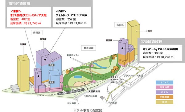 「ホテル阪急グランレスパイア大阪」は、南街区賃貸棟・東棟の5階~28階に位置します。客室は約23平方メートルを中心とする全482室で、レストラン、バー、ラウンジ、フィットネスなどを設置する予定です。