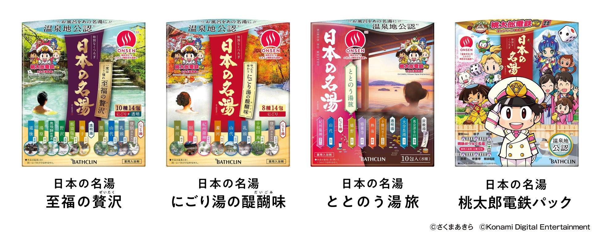 「日本の名湯 至福の贅沢」「日本の名湯 にごり湯の醍醐味」「日本の名湯 ととのう湯旅」の「桃太郎電鉄」デザイン(数量限定企画品)は2025年10月より順次発売予定です。