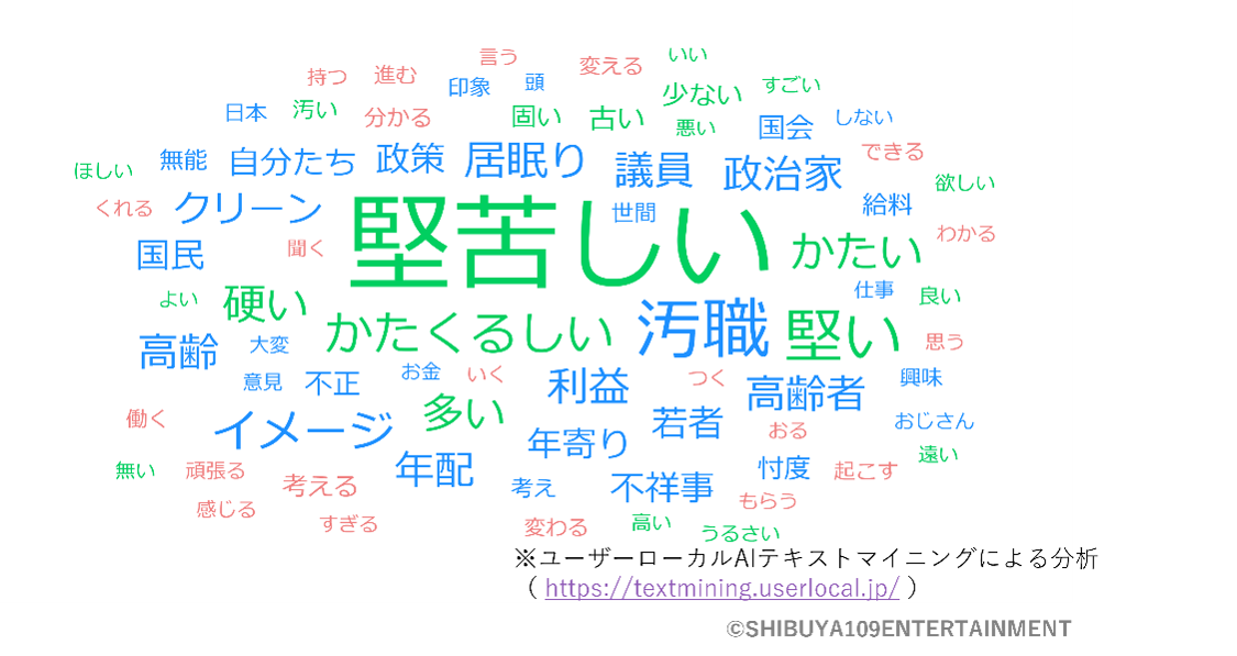政治家に対するイメージを自由回答で聞いてみても※図15、「堅苦しい」「汚職」「居眠り」などの内容が多く、グループインタビューでも「政治家の悪い行いばかりが話題になりやすいので、どうしても目についてしまう」といった声がありました。