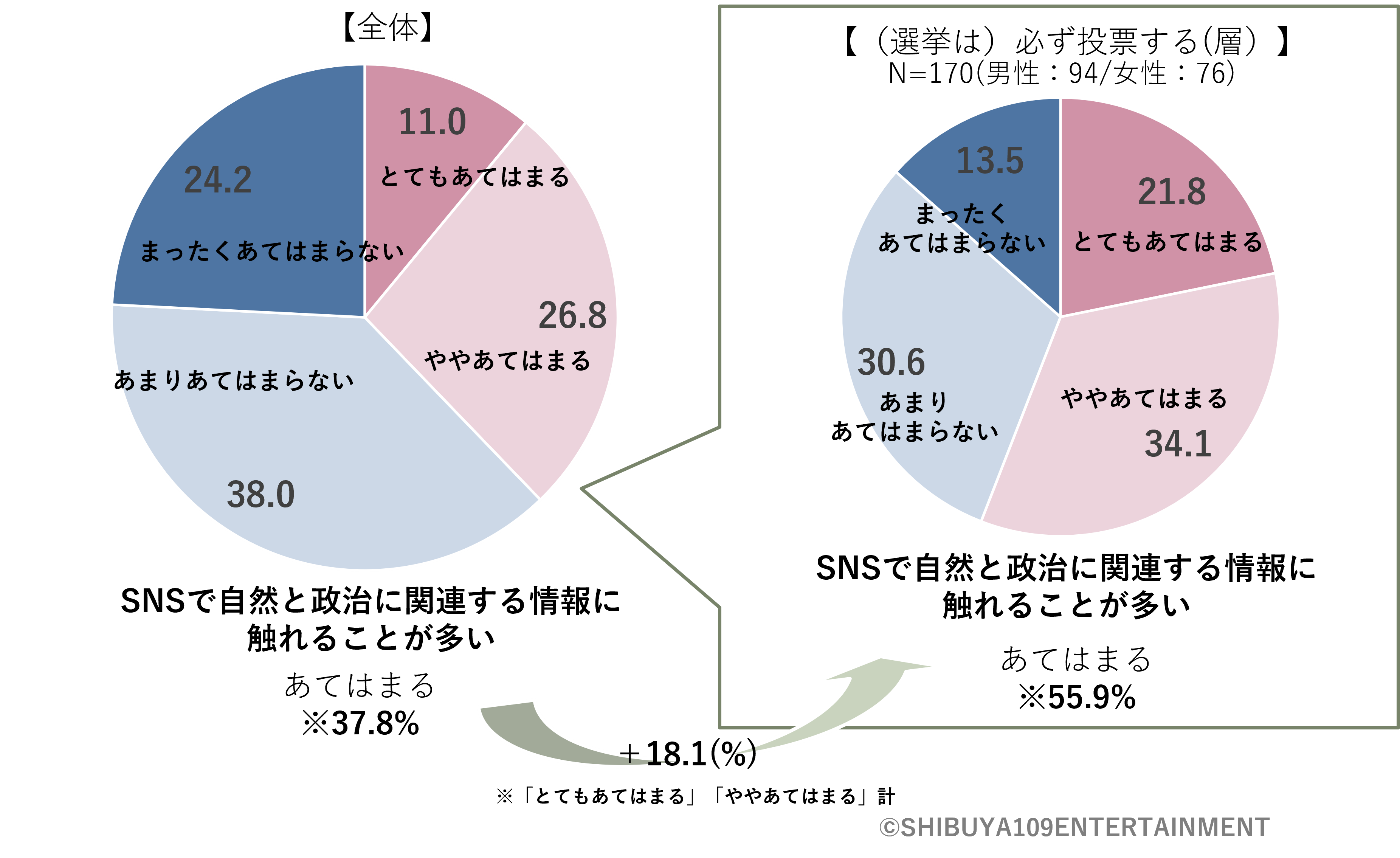 最後に、Z世代の政治との関わり方について調査しました。情報収集・情報発信について聞いたところ、「SNSで自然と政治に関連する情報に触れることが多い」と答えたのが37.8%※図12となりました。ただし、図1の投票意向で「必ず投票する」と回答した層に関しては、55.9%となっており、投票意向が高い層はSNSでも政治に関する情報への接触頻度が高いことがわかります。