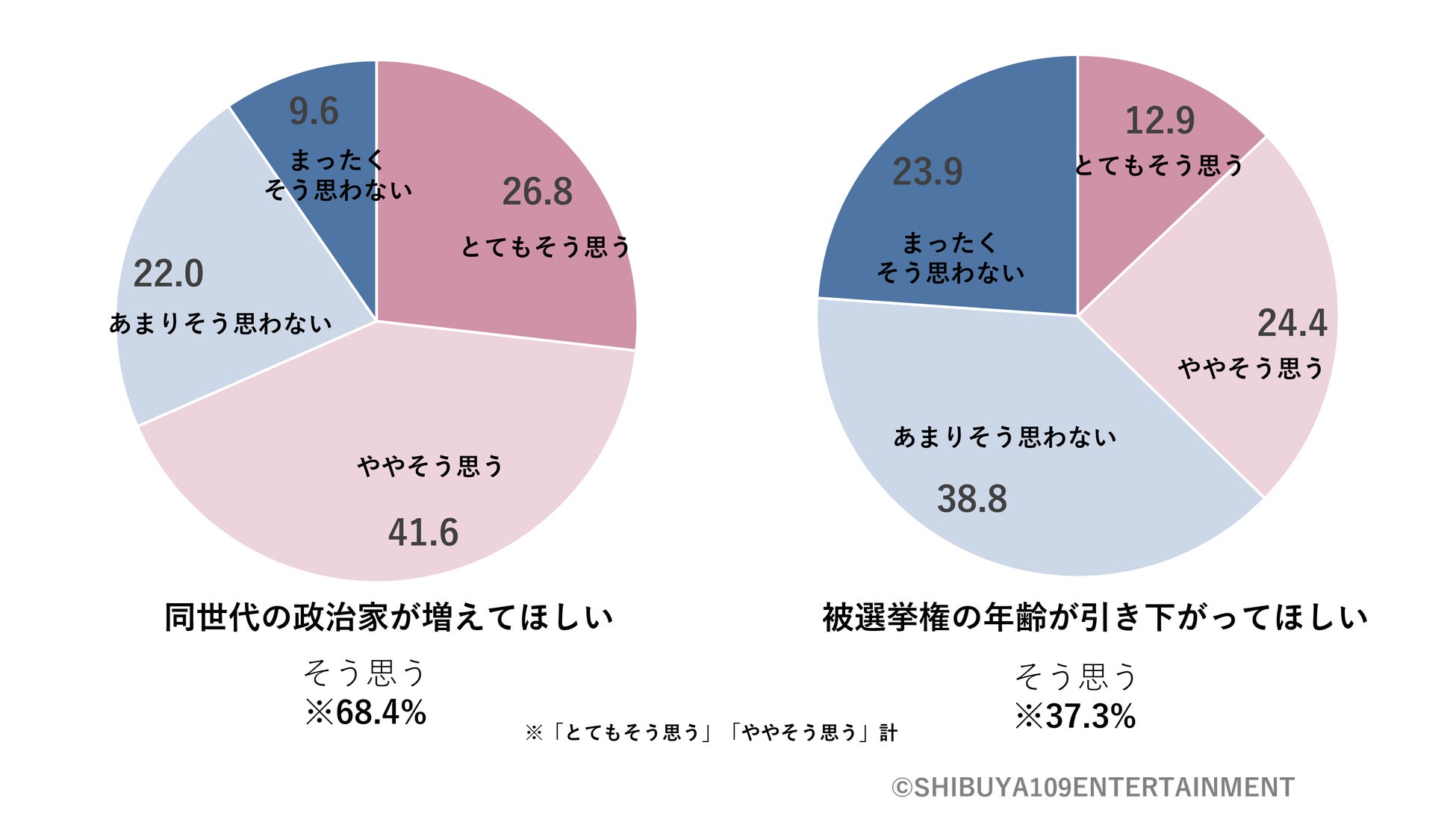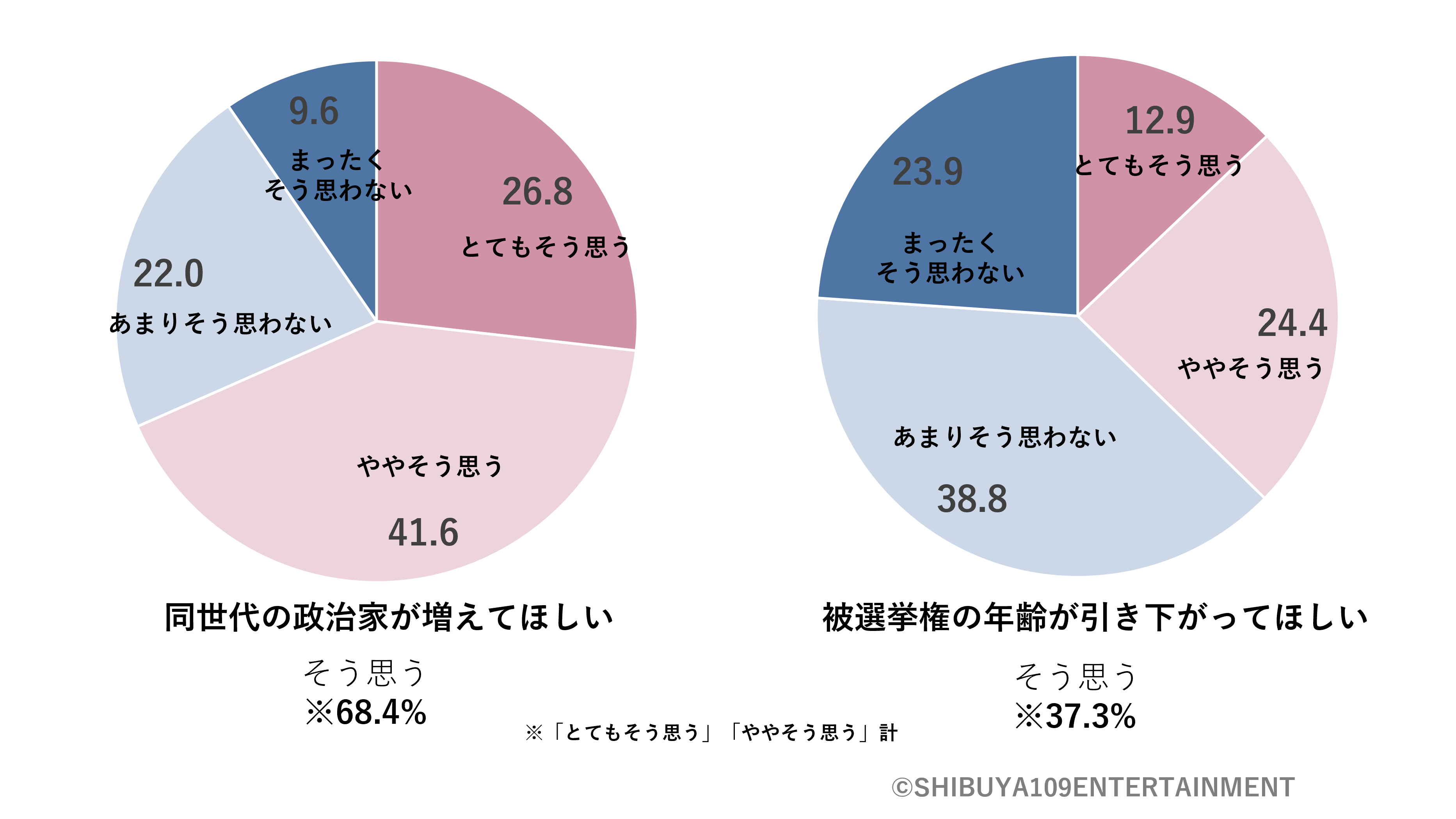 さらに、今後の選挙への要望にまつわる調査では「同世代の政治家が増えてほしい」は68.4%、「被選挙権の年齢が引き下がってほしい」は37.3%※図10となりました。グループインタビューでは、「(今は若手議員が少ないが)議員の年齢ごとの比率を新たに考えたほうがいいと思う。20代は経験が浅いという意見もあるだろうが、20代だからこそ見えている世界がある」「(議員の年齢層が高いが)50代以上の人たちとのジェネレーションギャップは絶対にある。被選挙権年齢を引き下げるべき」など若い世代の意見を取り入れることを求め、そのために若い議員が活躍することを望む声がありました。