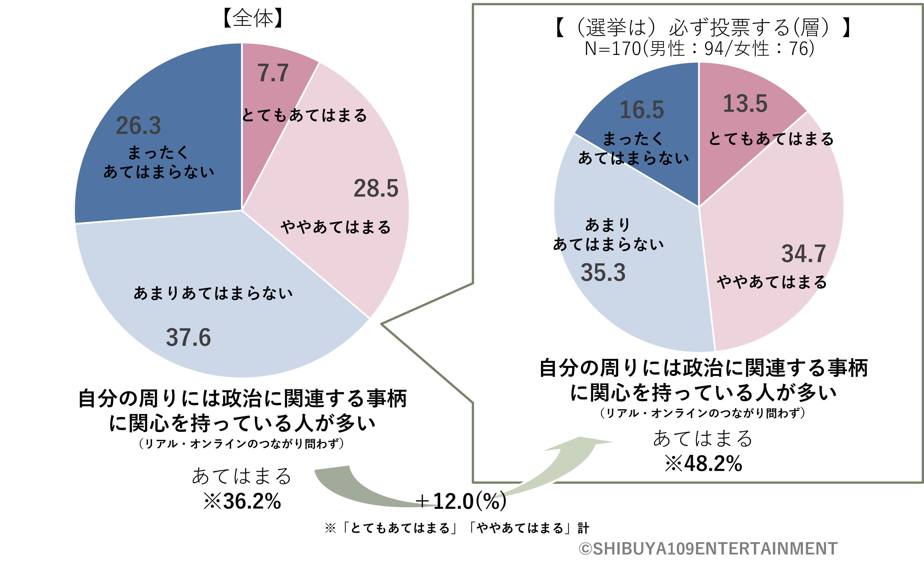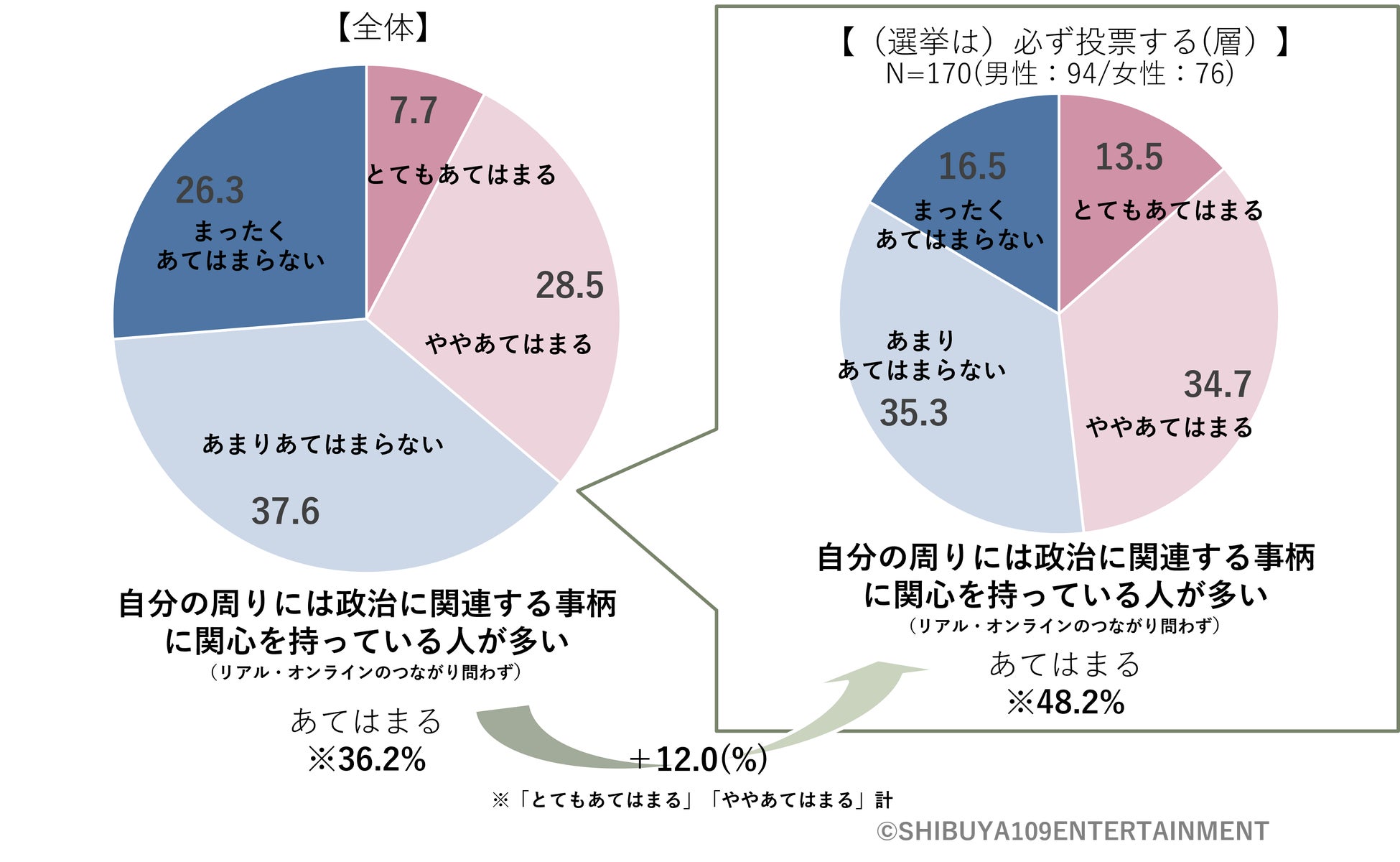 「自分の周りには政治に関連する事柄に関心を持っている人が多い」という回答も、全体では36.2%※図13でしたが、図1で「必ず投票する」の回答者では48.2%となっています。