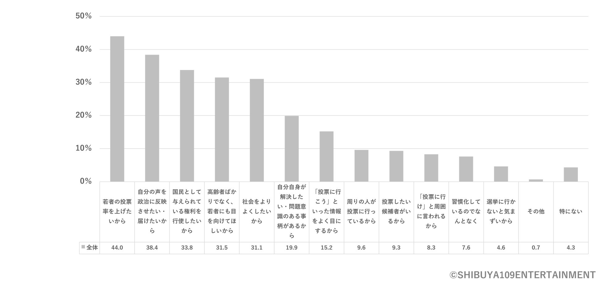 投票に行く理由※図2を聞いてみると、最も多かったのが「若者の投票率を上げたいから(44.0%)」次いで「自分の声を政治に反映させたい・届けたいから(38.4%)」「国民として与えられている権利を行使したいから(33.8%)」「高齢者ばかりでなく、若者にも目を向けてほしいから(31.5%)」「社会をより良くしたいから(31.1%)」となりました。