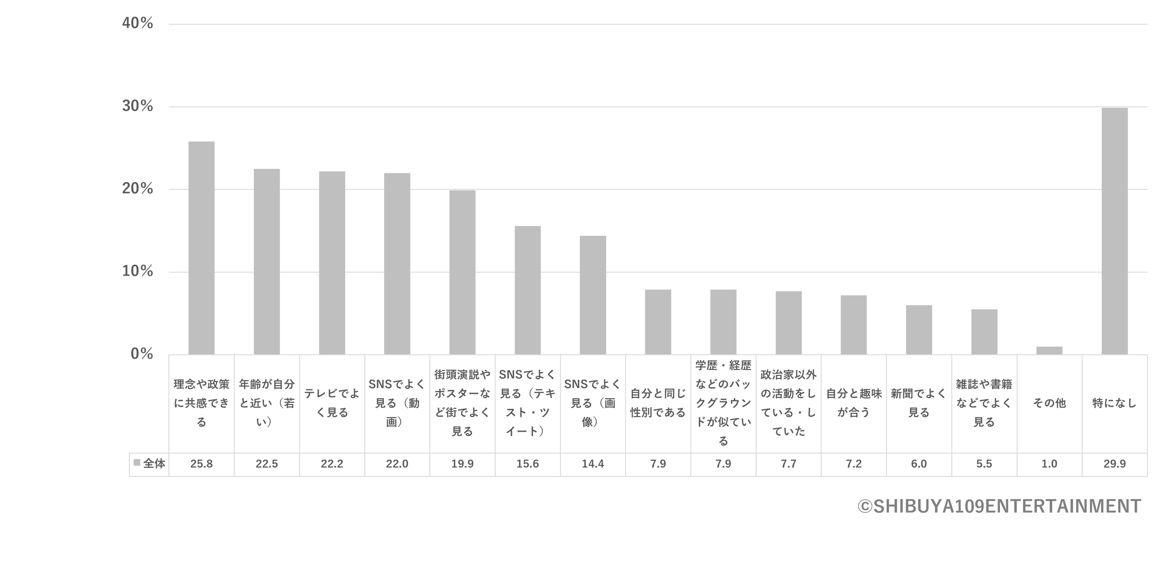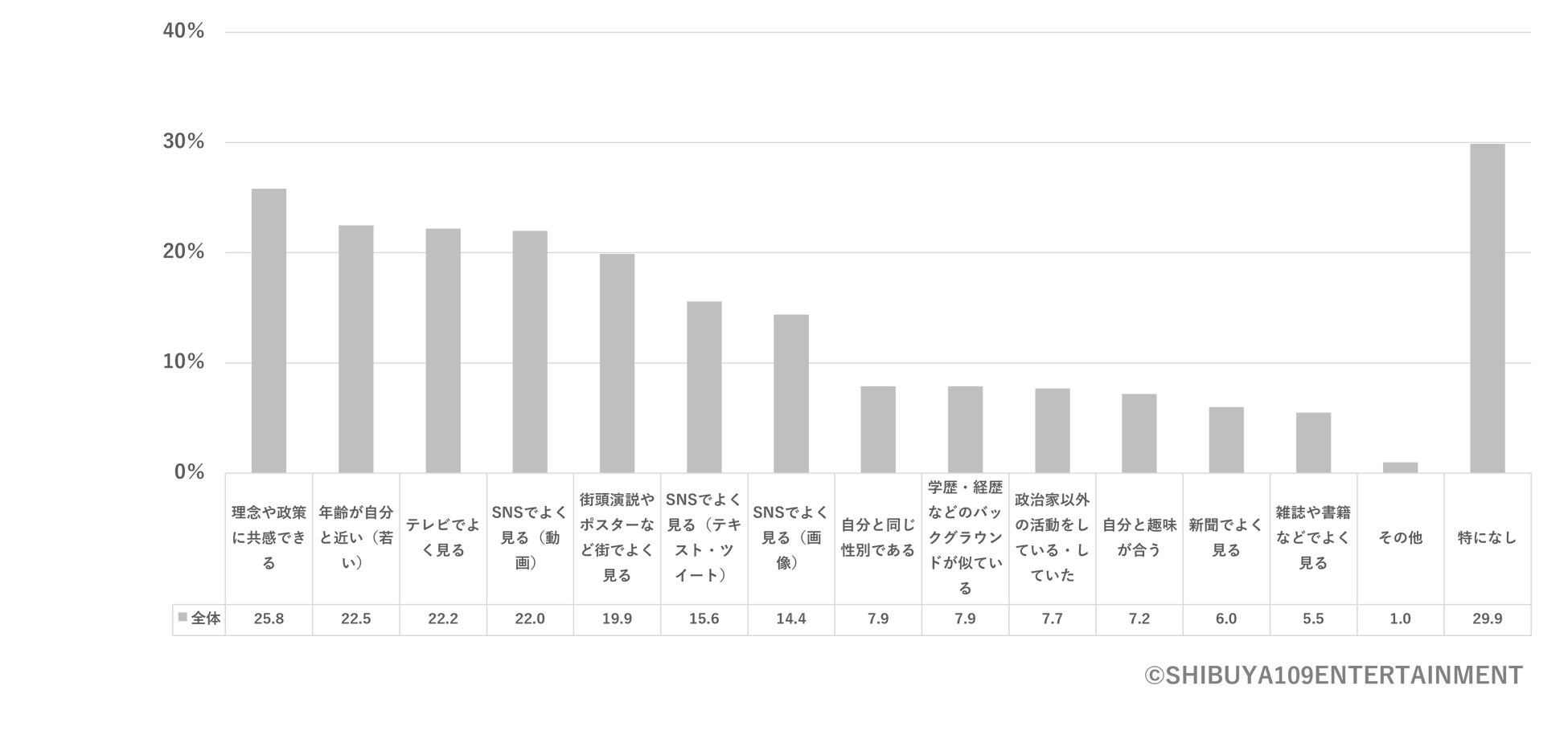 どのような政治家に親近感を覚えるか※図5という質問では、「理念や政策に共感できる(25.8%)」「年齢が自分と近い(22.5%)」「テレビでよく見る(22.2%)」「SNSでよく見る(22.0%)」「街頭演説やポスターなど街でよく見る(19.9%)」となっています。グループインタビューでも「若者を意識した政策を掲げている人を見ると気になる」「地に足の着いた政策を言っている人は信頼できる」といった声もあり、接触頻度が高いだけでなく、考え方に共感できる相手に親近感を覚えていることがわかります。