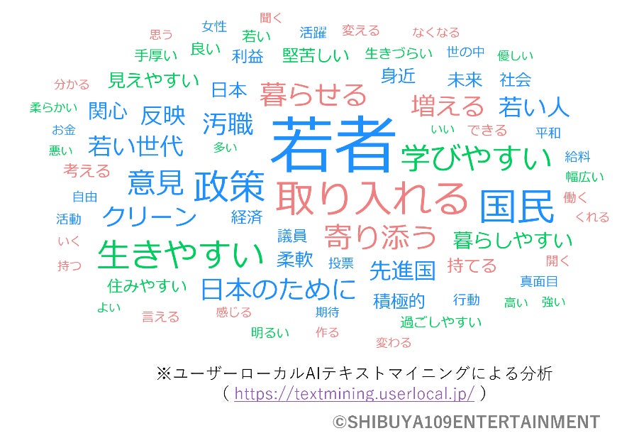 「あなたは日本の政治が今後どのようになって欲しいですか。ご自由にお書きください。」という問いへの自由回答をテキストマイニングで図示した結果※図11を見ても「若者」「若い世代」「若い人」などのキーワードが見られ、若い世代の意見を政治にもっと反映してほしい、という気持ちを抱いていることが見て取れます。