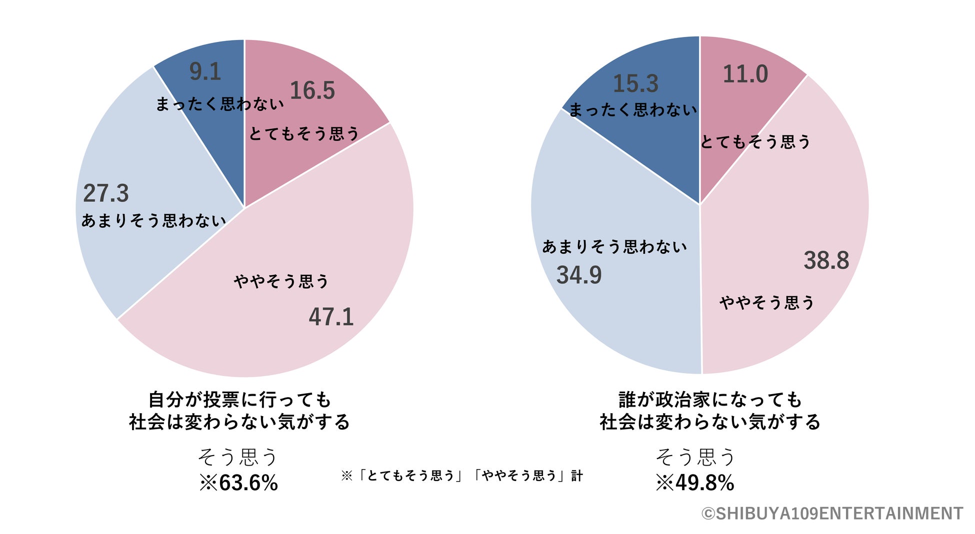 投票意向ありは7割を超え、理由は「若者の投票率を上げたい」となっています。一方、「自分が投票に行っても社会は変わらない気がする」が63.6%、「誰が政治家になっても社会は変わらない気がする」が49.8%と、多くのZ世代が「どうせ変わらない」と諦めモードであることもわかります。