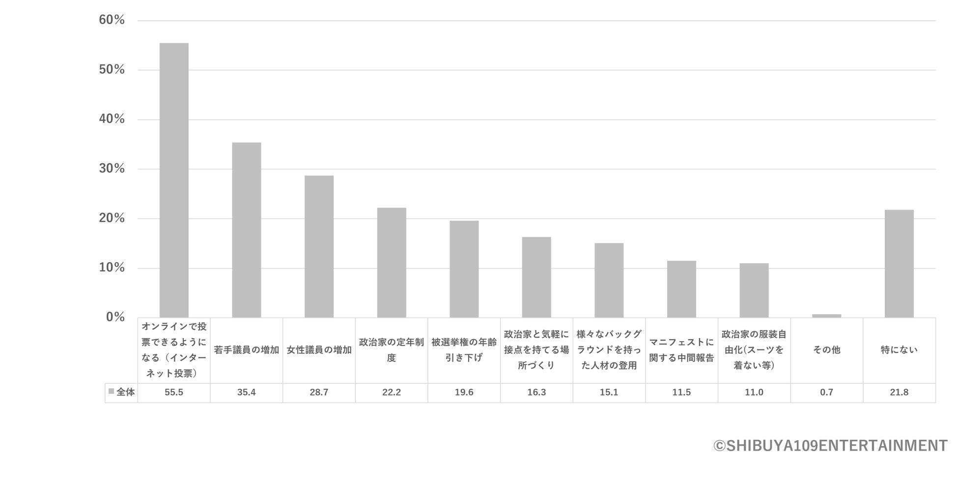 「今後、政治の仕組みとしてあったらいいと思うこと」※図9という質問では、「オンラインで投票できるようになる(インターネット投票)(55.5%)」「若手議員の増加(35.4%)」「女性議員の増加(28.7%)」などが挙げられました。グループインタビューでも、「選挙に行かなきゃと思うけど、会場に行くのが手間だし、仕事で行けない人もいそう。『スマホで投票できるようになったらいいね』と家族と話している」「大学生は(住民票が実家になっており)実家に戻って選挙に行かなきゃいけない人もいるので面倒な人もいるのでは」など、オフラインでの投票への不満がある一方で、「スマホで投票可能になると顔だけで選ぶなど適当に選んでしまいそう。通っている学校や会社など(アクセスのいい場所)でやってほしい」など、冷静な声も聞かれました。