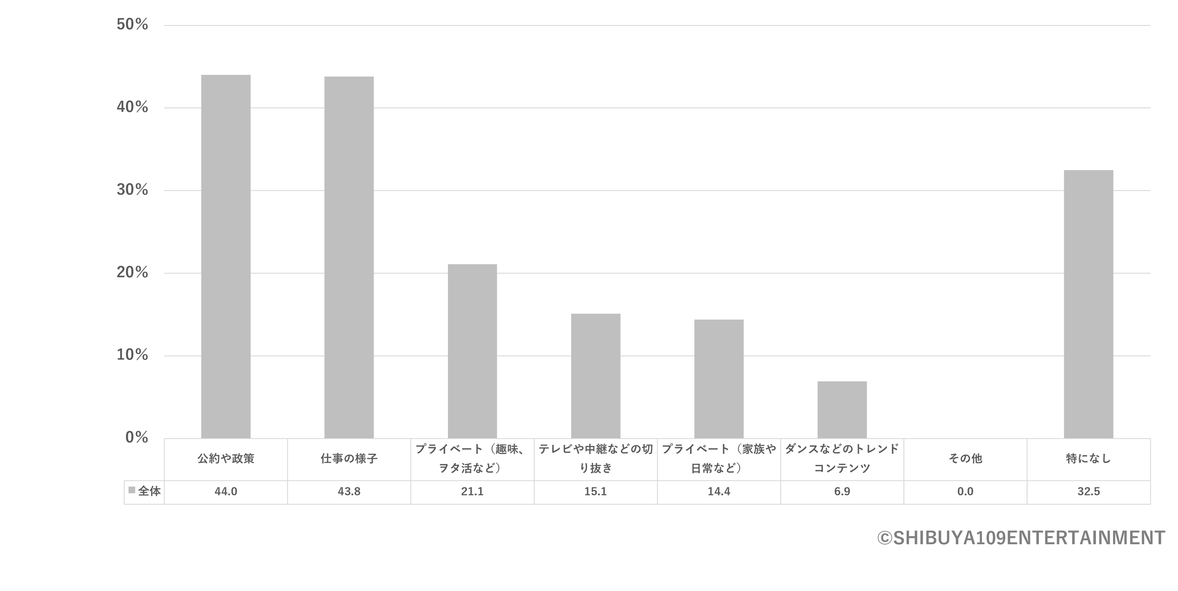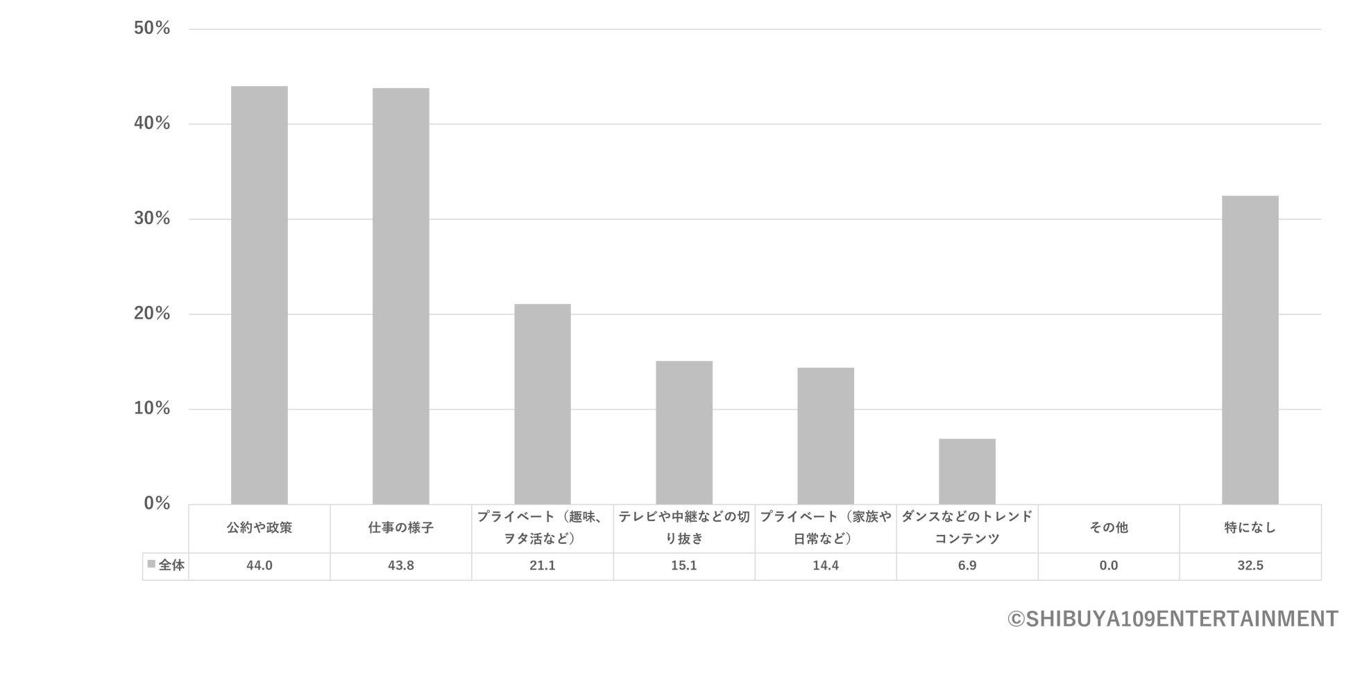 ただし、Z世代は複数のメディアに触れている影響もあってか「悪い部分ばかりニュースになってしまうのでメディアによって印象がつくられている部分もあると思う」「もう少し人間らしい部分も見たい」と、政治家のイメージに関してメディアの影響にも自覚的である様子も見られました。政治家のSNSでどのような発信をしてほしいか※図16という質問でも「公約や政策(44.0%)」「仕事の様子(43.8%)」のほか、「プライベート(趣味・ヲタ活など)(21.1%)」など声もありました。