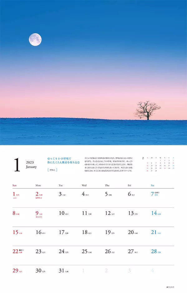 ブルーや淡い色彩を基調とした穏やかな自然風景が、あなたを眠りに導くことでしょう。毎月1つ「安眠のコツ」も紹介。美しい風景が静かな時間を演出します。