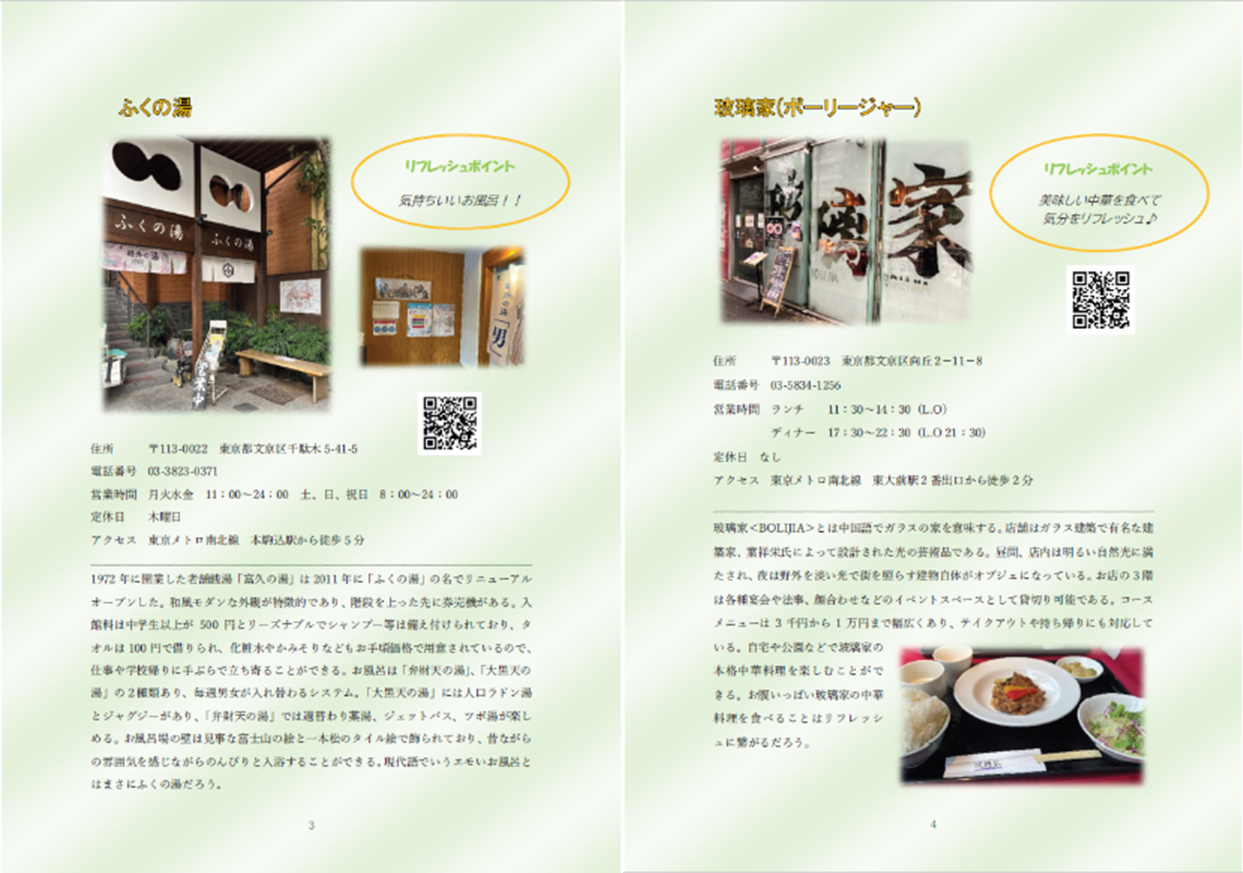 「東京ドーム天然温泉 Spa LaQua」 「東京ドームシティ」や「ホテル椿山荘東京」のアフタヌーンティー、小石川後楽園、下町の甘味処「ちょんまげいもたまる」、中東の文化を体験できる「ZAKUROらんぷ家~トルコ・モザイクランプ専門店」、老舗の銭湯「ふくの湯」、中華の「玻璃家(ボーリージャー)」、アイリッシュパブ風の 「Ailes Yushima」など、様々な観点から文京区内で別世界を味わってリフレッシュできそうな場所を紹介しています。