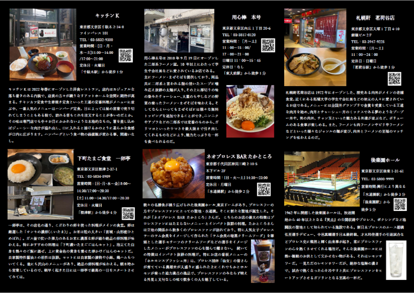 まんぷくコースの裏テーマはプロレス。プロレスの聖地、後楽園の周りにはレスラーやプロレスファンの集うお店がたくさん存在します。そんなプロレスファンも納得のコースを厳選して掲載しているのが本MAPの見どころです。