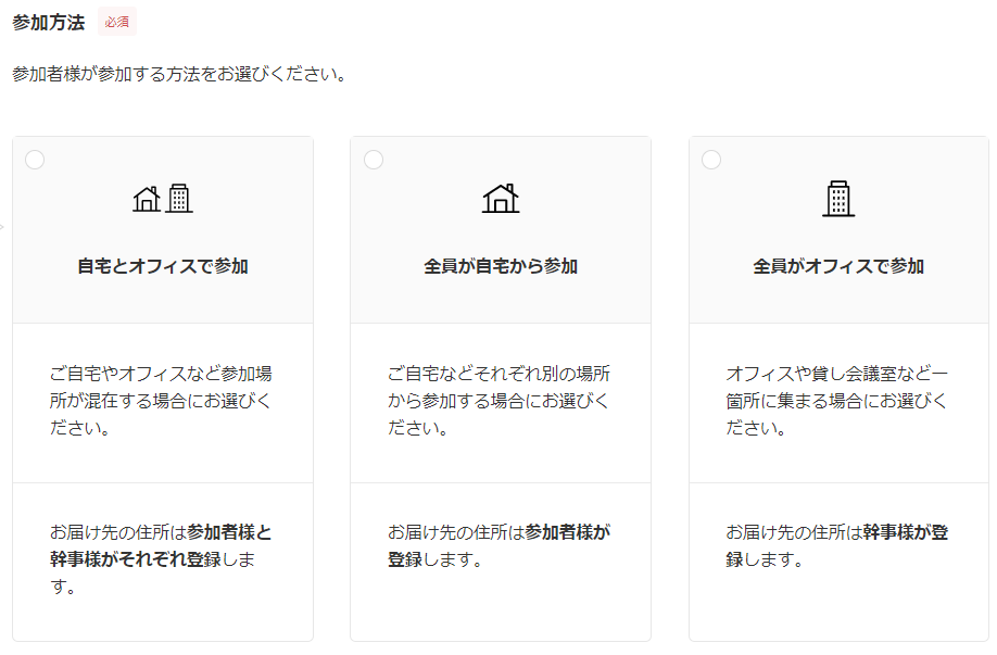 配送方法の選択機能は2022年3月にリリースし、ちょうど1年を迎えました。これを機に1年分のデータをまとめたところ「参加者が自宅とオフィスそれぞれから参加する場合」「参加者全員がオフィスや貸会議室など一か所に集まる場合」を選択した割合が直近半年で1.5倍に増える結果となりました。