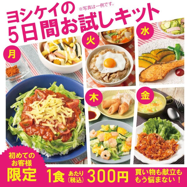 初めての方限定で月~金の5日間、おひとり様1食あたり300円~お試しいただけます。詳しくは「ヨシケイ お試し」で検索!