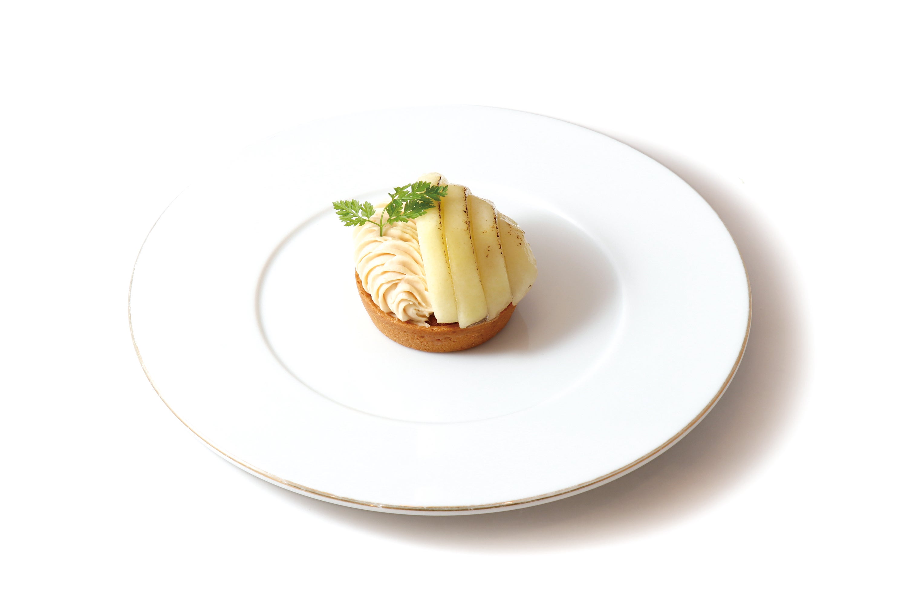 チョコレートの濃厚なコクと随所に配した林檎・洋梨などフルーツの酸味、ピスタチオやナッツの香ばしさが一体となって