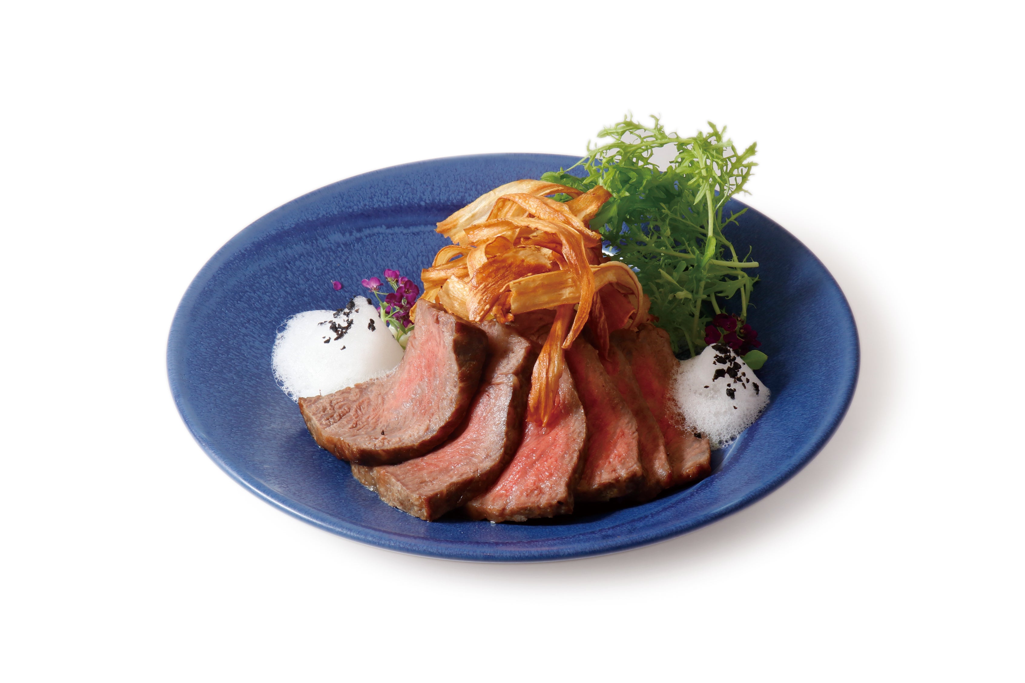 レアに火入れした国産黒毛和牛サーロインの薄切り、焼きリゾットに熱々のブイヨンをかけて仕上げをします。