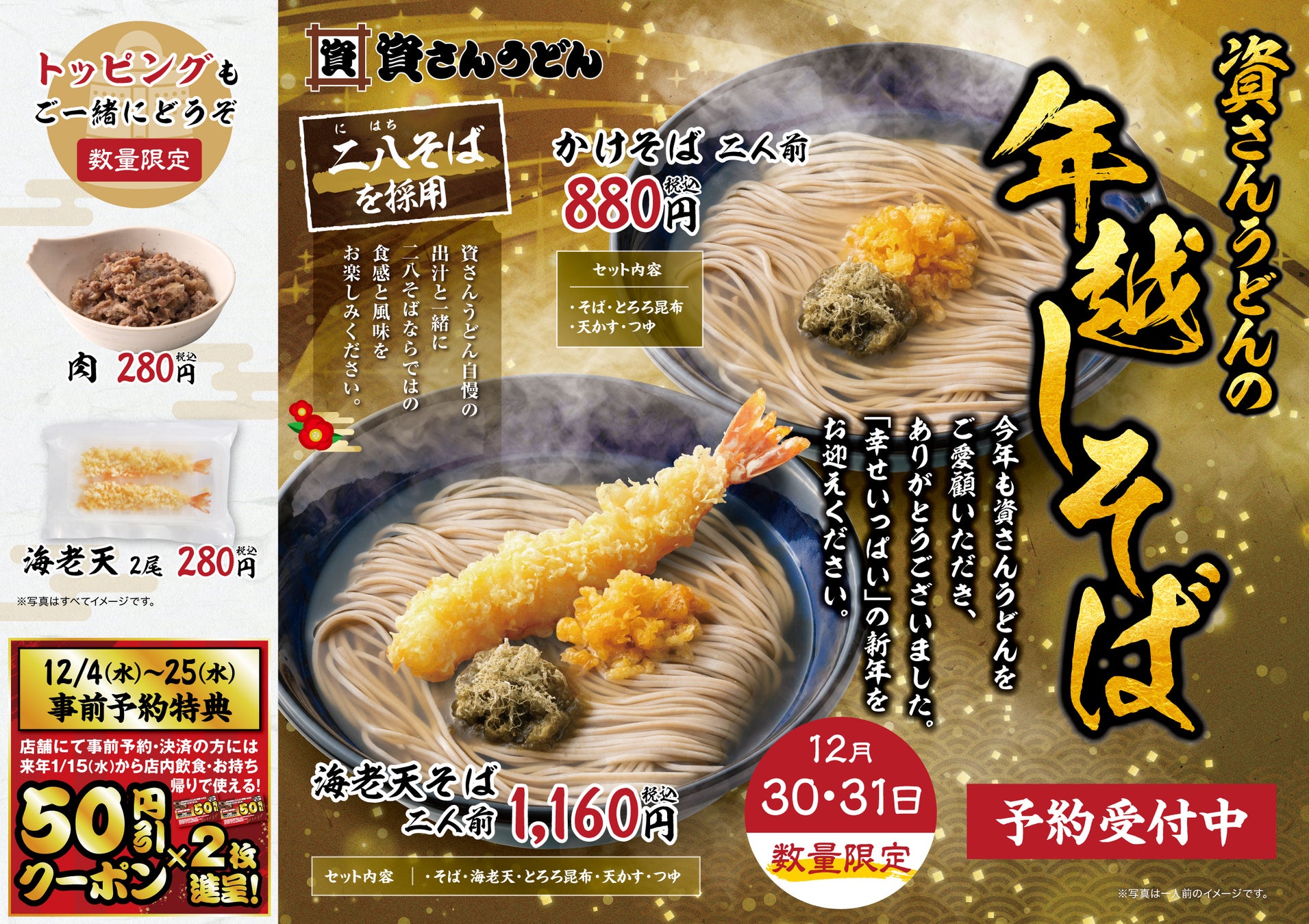 「資さんうどん」では、毎年ご好評いただいております、お持ち帰り専用「年越しそば」のご予約受付を12/4(水)〜開始いたします。今年の「年越しそば」には、事前予約で嬉しい特典付き!「年越しそばセット」1セットにつき、年明け1/15(水)〜店舗でご利用いただける50円クーポンを2枚をお付けします。