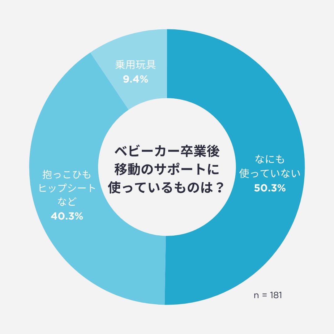 しかし、その一方で、ベビーカー卒業後のお出かけでは「子どもが疲れてしまう」「荷物がかさばる」といった新たな悩みが生まれています。実際に「抱っこひもやヒップシートで対応している」(40.3%)という回答も多く、子どもの自立を促しつつ、必要なときにサポートできる移動手段のニーズが高いことがわかります。