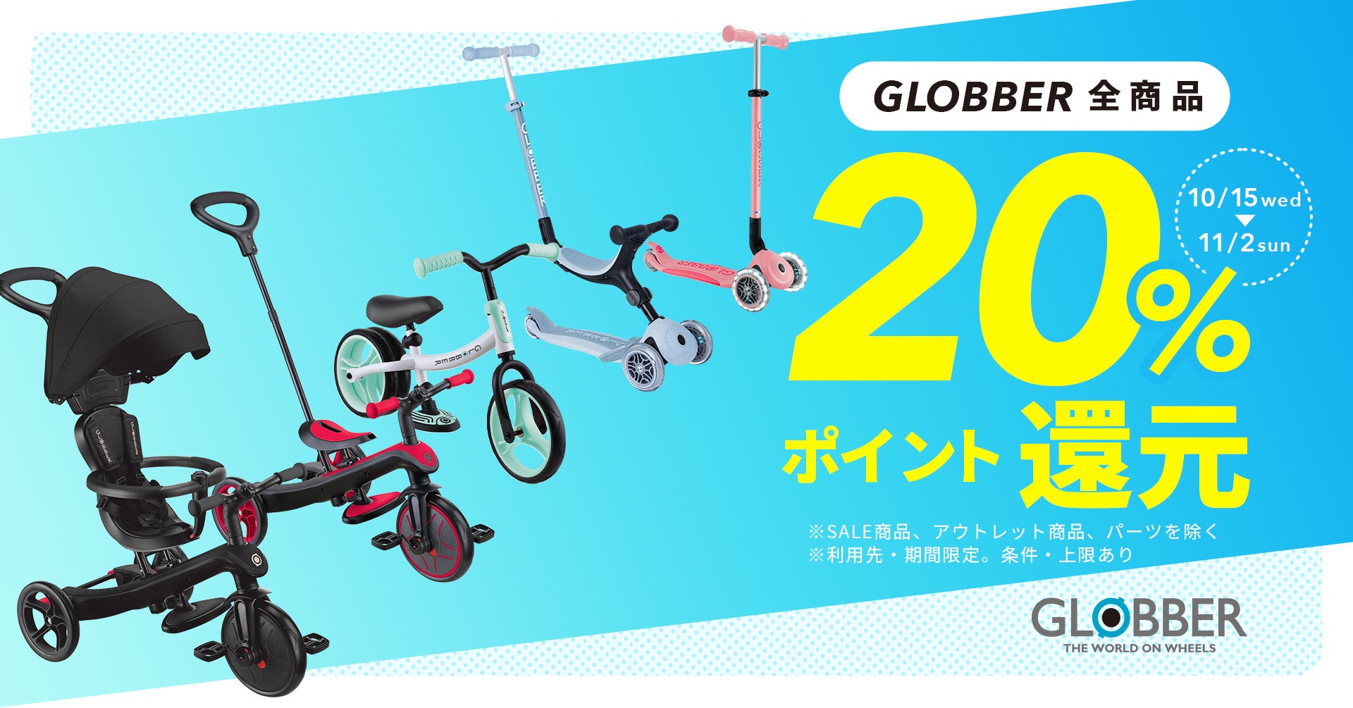 DADWAYの店舗、各オンラインショップでは、2025年11月2日(日)までの期間限定で、GLOBBER全商品※対象のDADWAYポイント20%還元キャンペーンを実施しております。この機会に、お子さまの成長を支えるお外遊びの相棒を選んでみませんか。