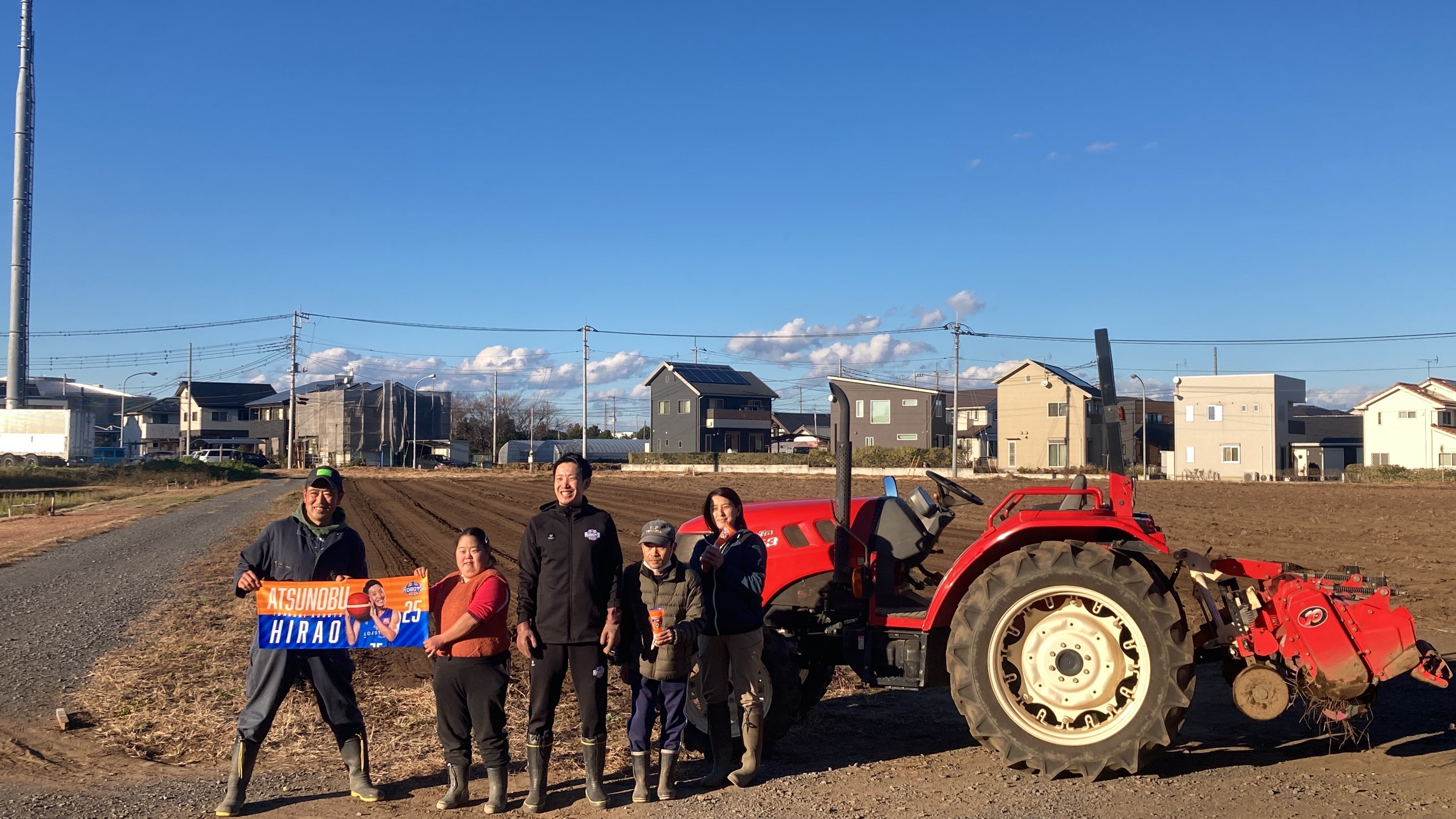 施設内の見学を終え、当施設の畑で平尾選手がトラクターに体験乗車しました。