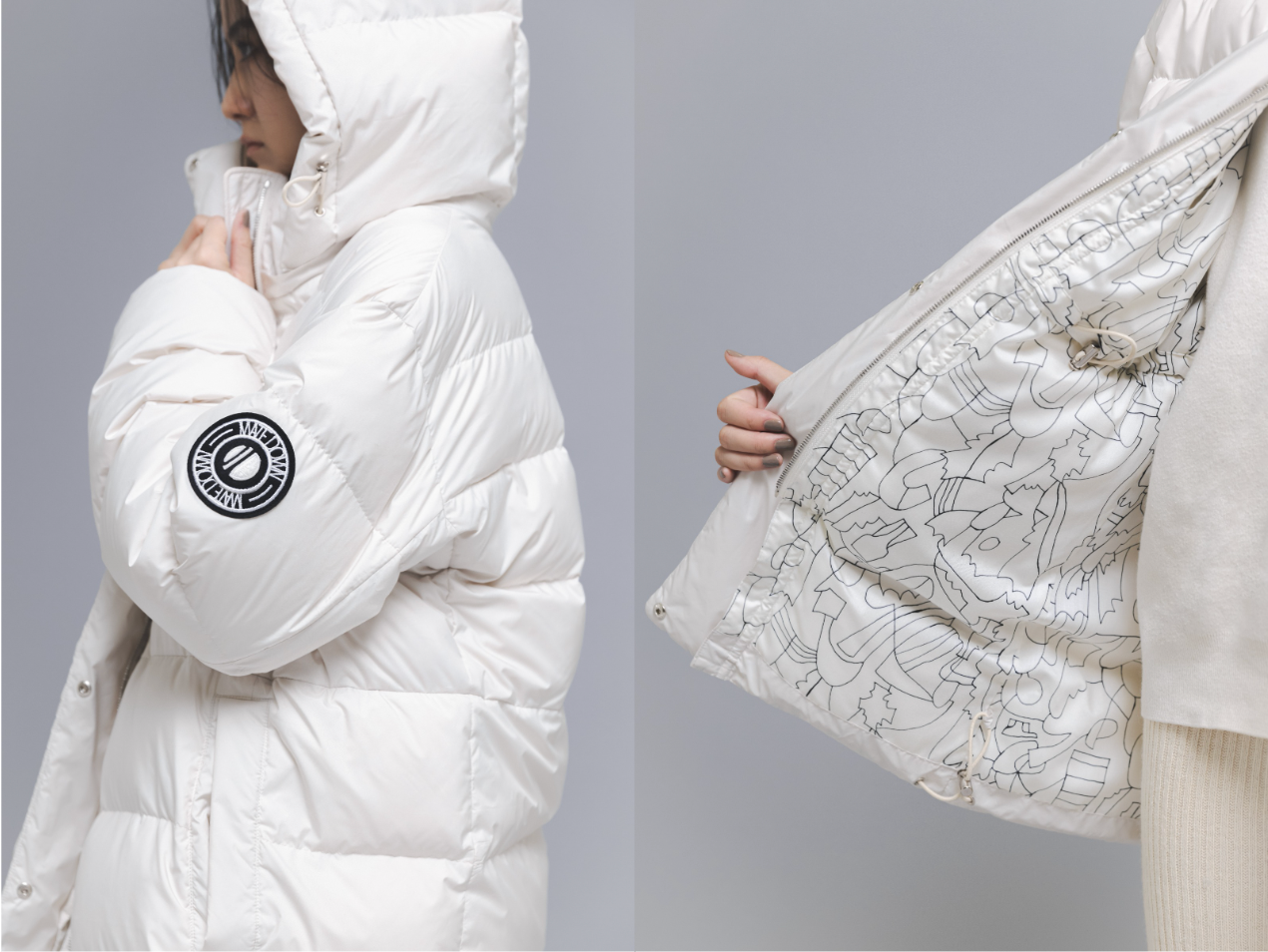 「つくる」から「つかう」まで、「しあわせ」を追求し、着るエシカルとして100%国産の素材にこだわった「IWATEDOWN」は、「岩手がも」の羽毛を使用した軽い着心地と上質な素材が特徴のダウンジャケットです。「岩手がも」は岩手県田野畑村の雄大な自然環境の中で飼育されています。岩手県にはダウンの縫製工場が多いという地域性があり、実は一般流通している国産ダウンの縫製は岩手県内で行われているものが多いという特徴があります。岩手の大自然と職人の技を掛け合わせ、100年先まで長く使っていただける1着を目指して生み出されました。裏地にはヘラルボニーの契約アーティスト小林覚と工藤みどりの2名のアートを起用。日常のなかにアートが自然と溶け込むように、普段使いのコーディネートにも使いやすいモノトーンの作品を生地に載せています。