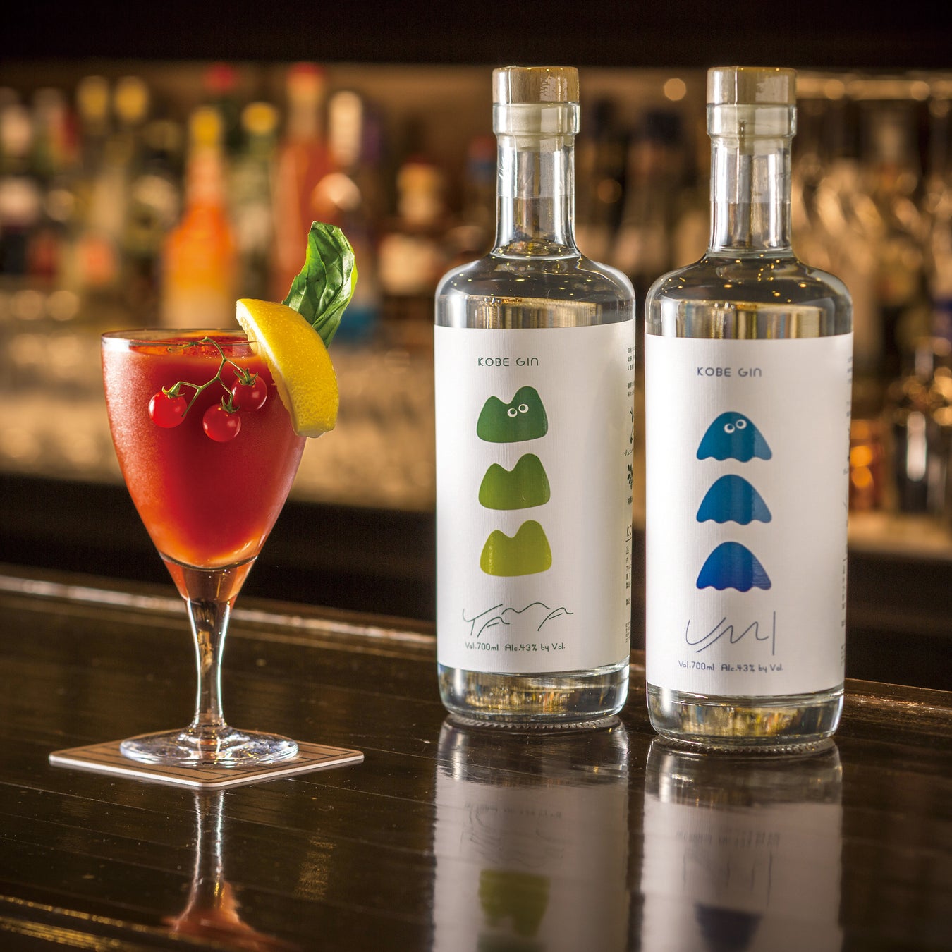 神戸蒸溜所初の「K O B E G I N 」と「神戸旧居留地トマトジュース」を使い、スパイスを利かせた神戸× 辛味カクテル。ジンは、有馬山椒や静香園の緑茶茶葉など兵庫県産の山のボタニカルが香る「Y A M A 」と、海苔やいかなごのくぎ煮など磯の香りが含まれた「U M I 」があり、お好みの方でご提供いたします。