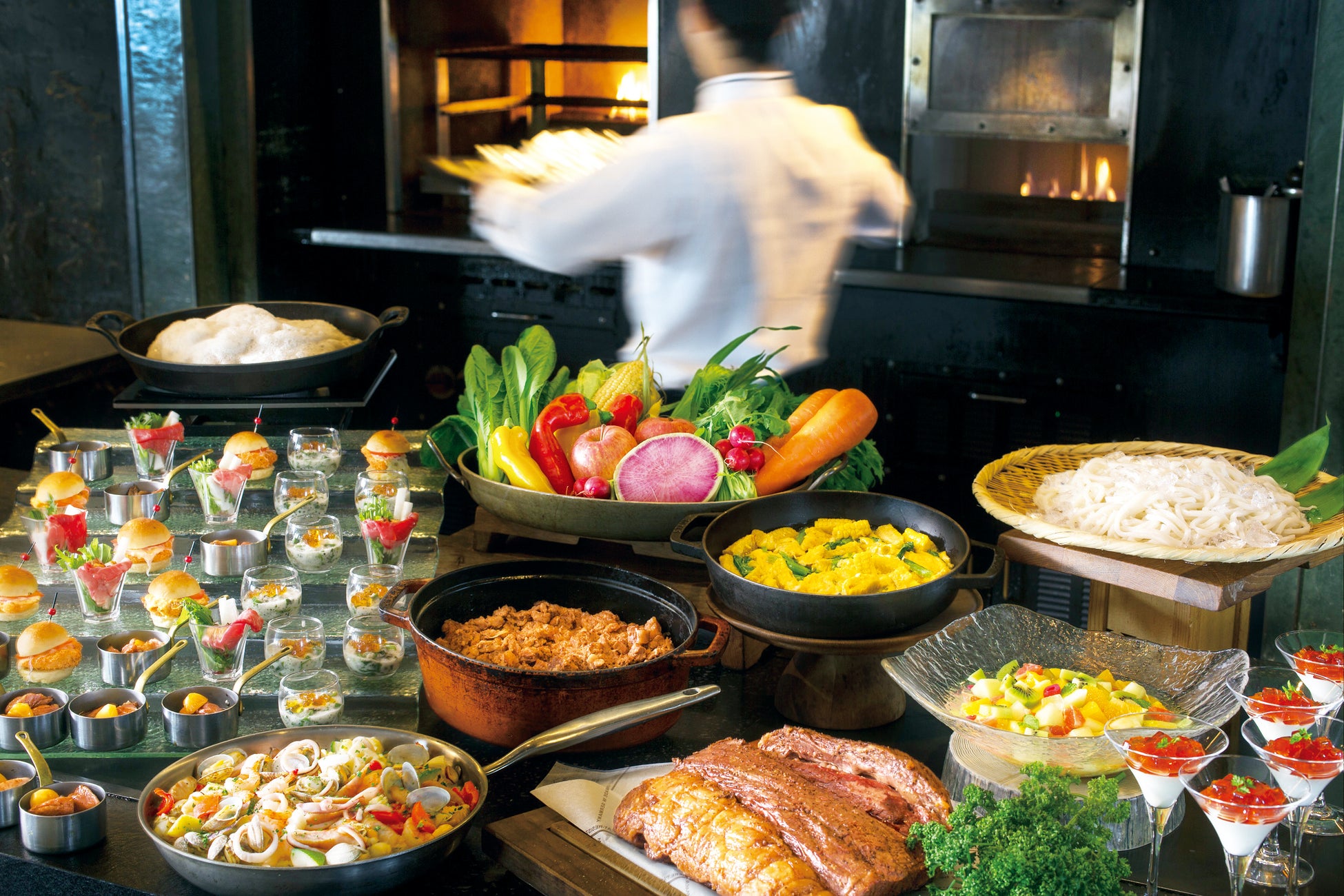 兵庫県食材を使った種類豊富なシン・メニューが一堂に!骨付き神戸ポークとりんごのキャラメリゼ、神戸ビーフぼっかけ煮と冷やしうどん、神戸ビーフシチュー(土・日曜ディナー限定)など神戸の味や、三田ポークのトマトクリームパスタなど新メニューのほか、開業当時の味や定番の品を進化させた料理が集結。ローストビーフやデザートにもご期待ください。
