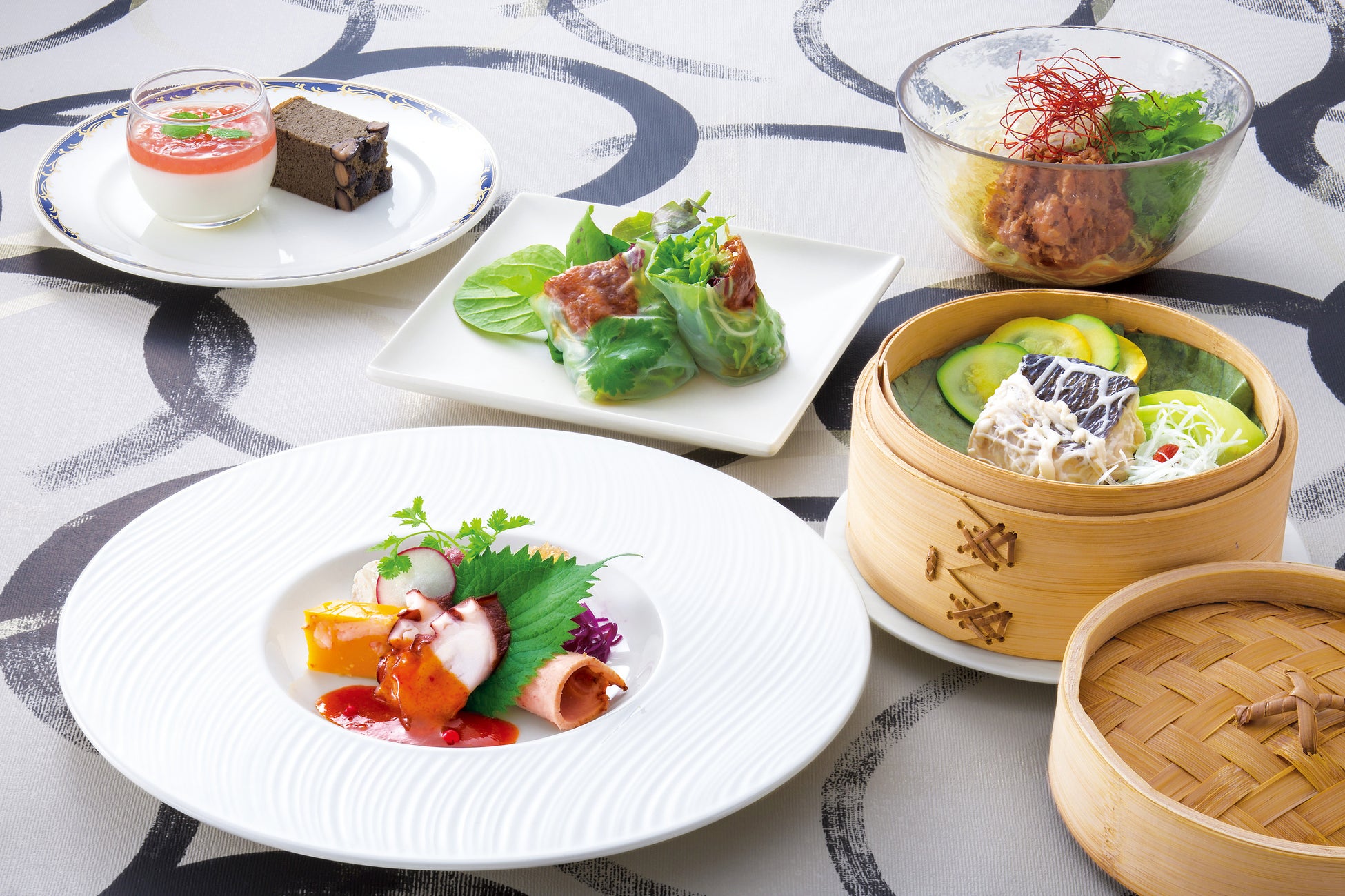 多彩なシン・メニューで兵庫の魅力を伝える中華のコース。進化系は、明石蛸など兵庫食材の前菜をフレンチのように盛り合わせた品や、ペキンダックの生春巻き仕立てなど。新しい試みは、網脂を巻いたスズキを蓮の葉とともに蒸した一品。ほかに、心を癒す「冬瓜と干し貝柱のとろみスープ」、ピリ辛の「三田ポークとわさび菜の担々麺」なども登場。