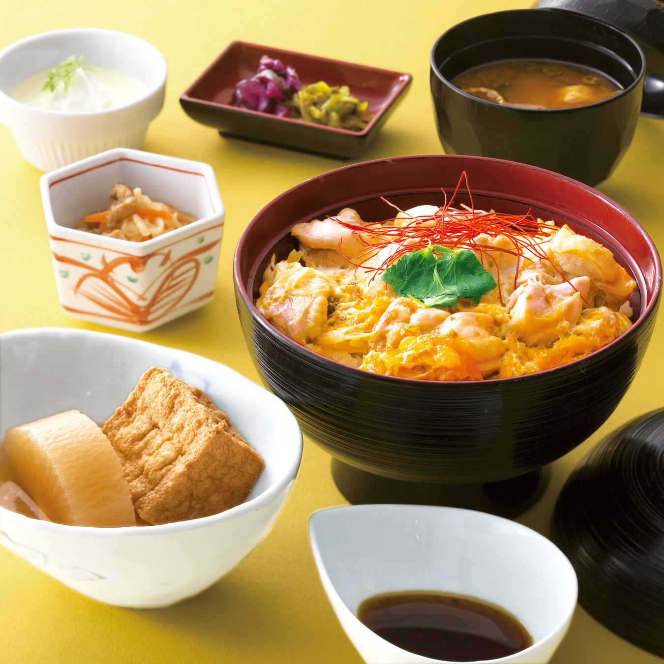兵庫県産食材を使用した「但馬どりと七福卵の親子丼」がメイン。プリッとした鶏肉とコクのある玉子が絡み合い、山椒が利いた醤油ダレをかければ、ピリリと辛い刺激が走る一品。名物のおでん2 種は熱々で登場。そのほか、赤だし、小鉢、季節のデザートも付いたホットなランチで暑い夏を乗り切って。